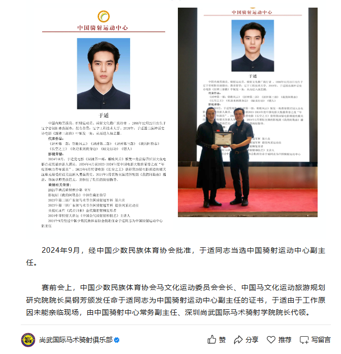 据悉,此前于适被任命为中国骑射运动中心副主任,因工作原因于适未能亲临现场,由中国骑射中心常务副主任、深圳尚武国际马术骑射学院院长李杰(李云义)代领任命证书。
