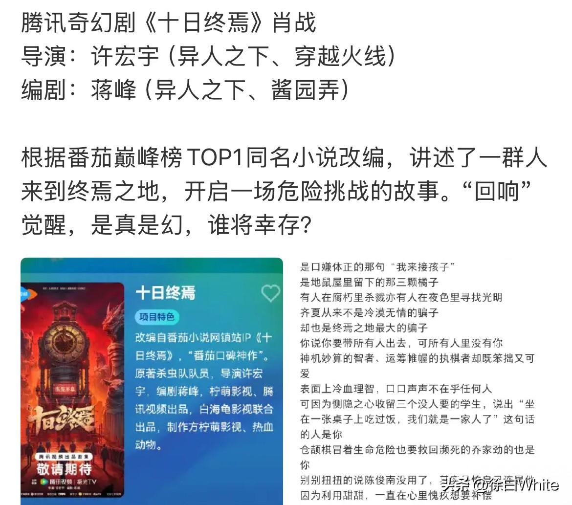 10月30日,肖战下部剧《十日终焉》,无限流悬疑题材小说巅峰第一名,🍅镇站之作! 男频文里很难遇到如此极具魅惑的男主,很喜欢描述男主的一句话,齐夏,他是终焉之地真正拥有神性的“神”,这句话应该也是很多人点开这本书的原因,钩子又深又真,牢牢抓住了读者的好奇心,还有一句,齐夏,终焉之地最大的骗子,两级反转! 说实话,很期待肖战出演这部剧,但又对他的班底表示怀疑,许宏宇的异人之下拍的不错,穿越火线就一塌糊涂,蒋峰脑洞很大又非常极端,他们组合起来,一是能不能拍出来这部剧的精髓?二是能不能拍好? 不管怎么说,剧本是好剧本,肖战也很合适,还是先保持期待!