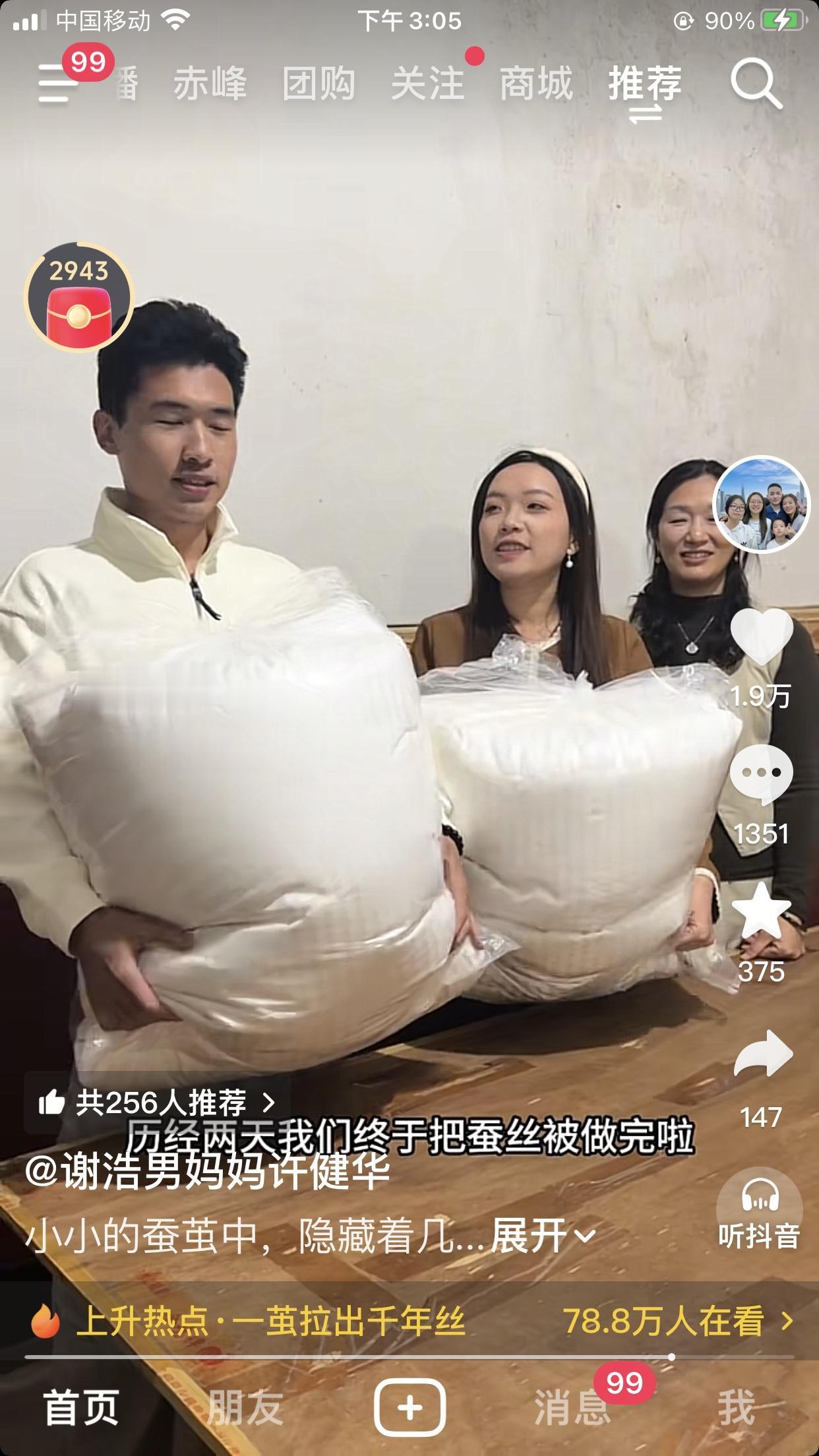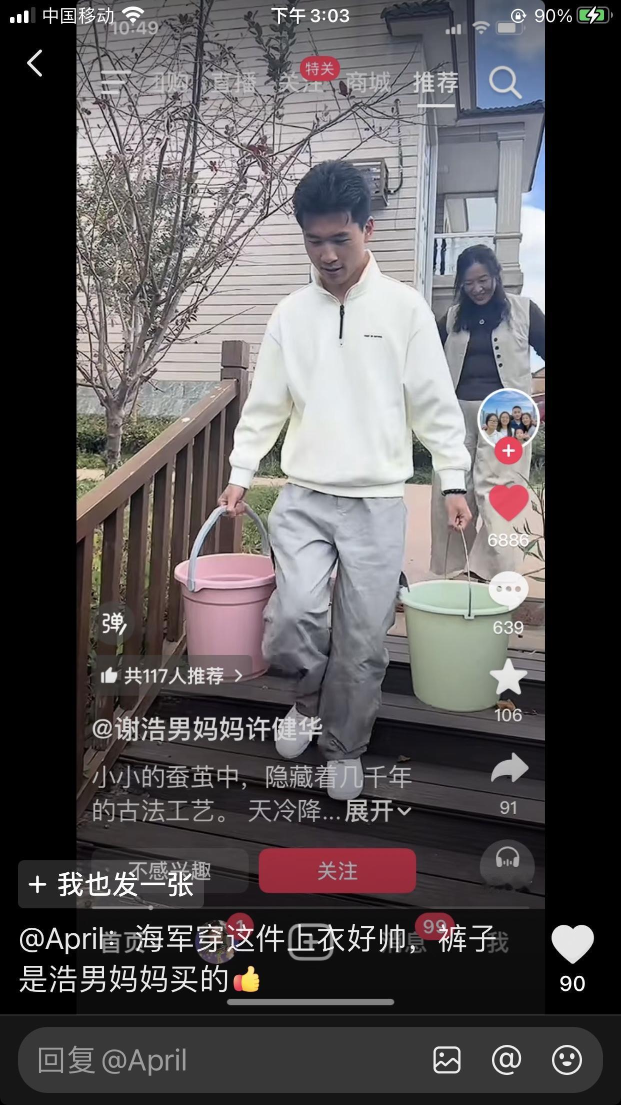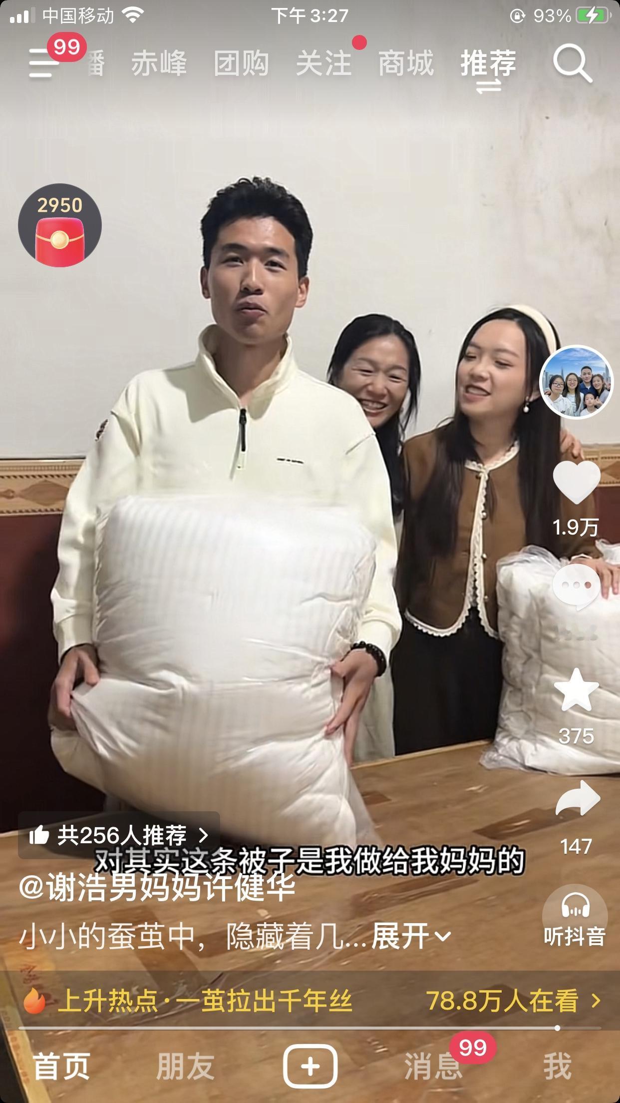 海军终于也能想起自己的妈妈了。11月2日直播前海军亲手做了一条蚕丝被送给妈妈:虽然我不能在你身边陪你,但我希望通过力所能及的方式来弥补这份遗憾,希望能通过这条被子代替我陪你度过寒冬。 是的,自从谢浩男认亲以后,海军就陪着浩男妈妈逛北京,举着浩男妈妈看升旗,虽然说这也是因工作需要,可是自己的妈妈也需要陪伴啊。