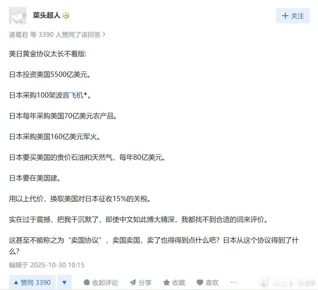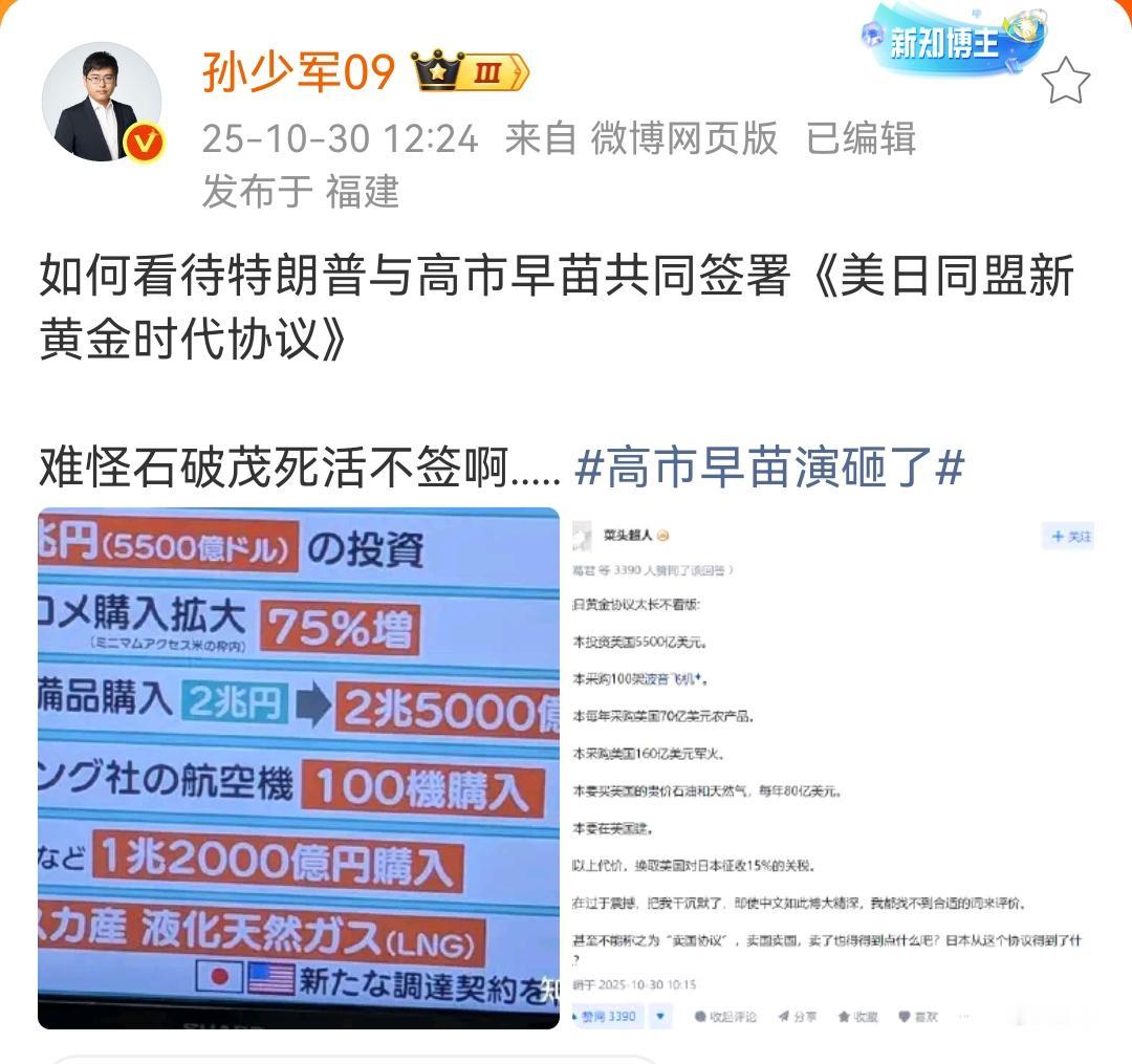 孙少军:如何看待特朗普与高市早苗共同签署《美日同盟新黄金时代协议》,难怪石破茂死活不签啊! 这个协议换成其他人还真不敢签呀,这个协议等于说把日本全部给卖国掉了,如果使用三个字来形容,大家会想起哪三个字? 用这么大的代价换取的是美国不对于日本加征15%的关税,这个代价实在是太大了,而且日本每年还要多购买美国价值70亿美元的农产品。 一次性沉没的成本也非常的高,还要买美国的武器,还要在美国投资,买美国的飞机,这个倒是挺正常的,毕竟本身日本的航空公司也需要。 各位是怎么看的?欢迎评论区留言。