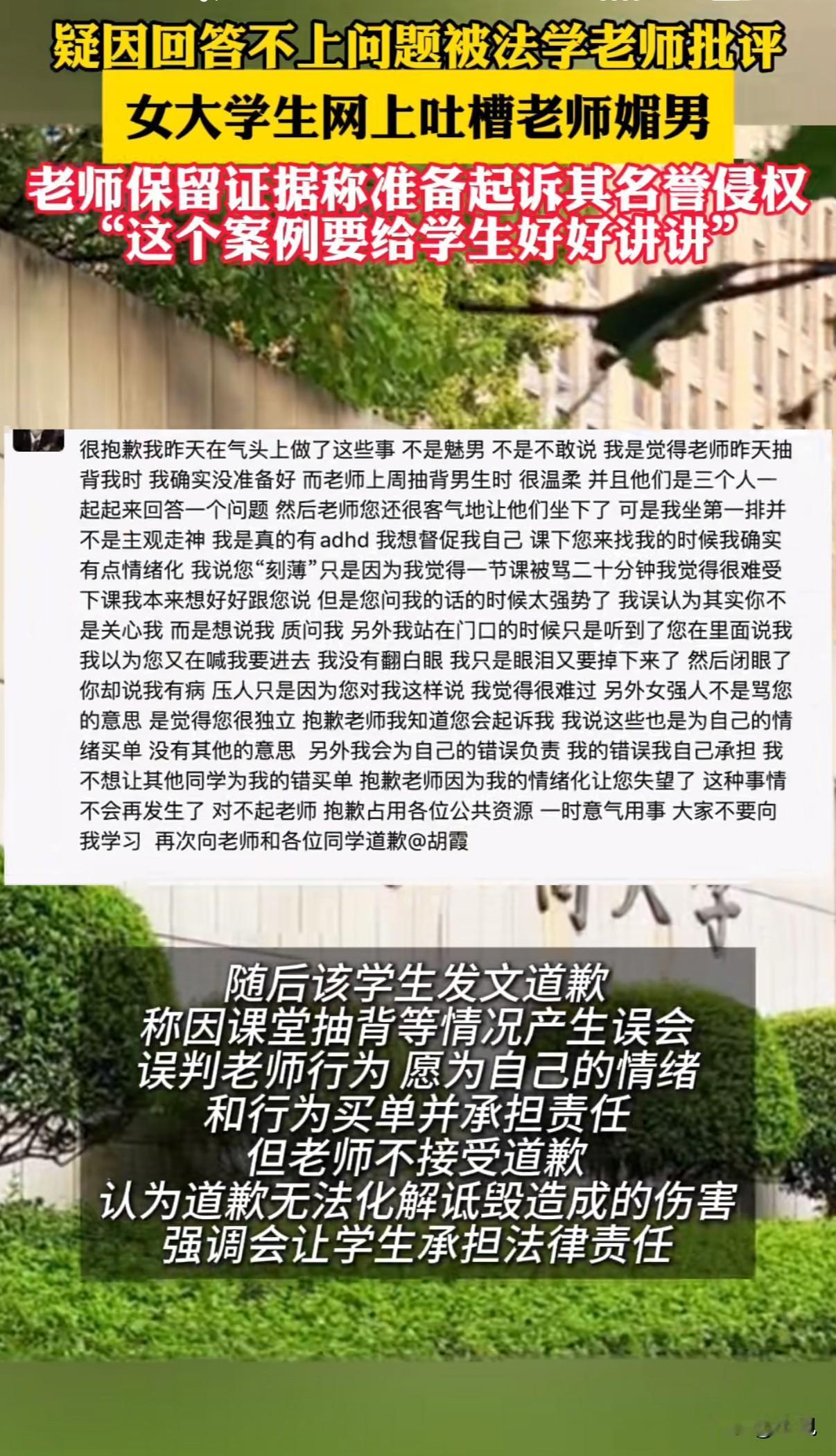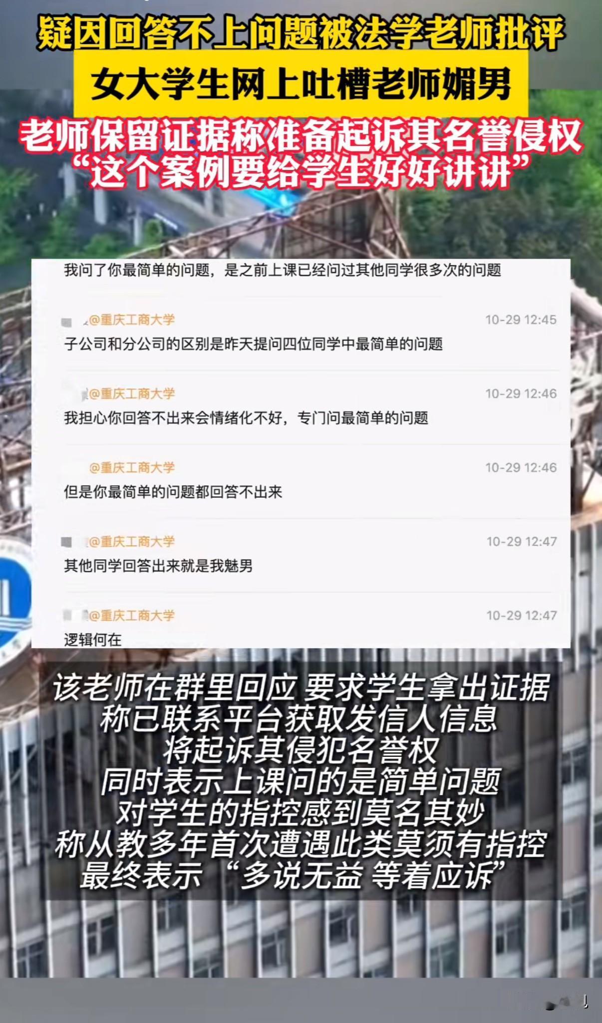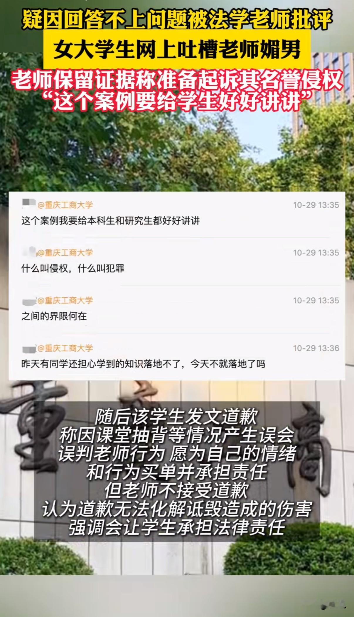 “祸从口出”!学生匿名吐槽老师刻薄,老师反手要起诉侵犯名誉权,双方都觉得自己委屈。 10月29日,重庆工商大学校园账号"工商秘密"收到匿名投稿。学生李某吐槽法学院胡老师"上课刻薄、把没礼貌当幽默"。这条消息在微信群快速传播。 胡老师在企业微信强硬回应:要求48小时内提交证据,否则起诉侵犯名誉权。她已联系平台获取投稿人信息,并完成证据保全。特别强调"网络不是法外之地"。 学生李某紧急道歉。她解释是因为上课提问没答出来,被当众批评20分钟感到难堪。否认"媚男"是贬义,辩称本意想夸老师是"女强人"。还提到自己患有注意力缺陷障碍,并非故意走神。 胡老师拒绝接受道歉。"道歉若有用,要法律何用?"她表示诋毁造成的伤害无法用道歉弥补。随后宣布解散课程群、取消课堂互动和考勤,计划回重庆后立即起诉。 这件事的争议焦点很明确:学生的吐槽是否构成法律意义上的侵权。 从法律角度看,名誉权侵权需要同时满足三个条件:存在捏造事实的行为、造成社会评价降低、行为和损害之间有因果关系。 学生描述"被当众批评20分钟"属于个人感受范畴。如果基本事实存在,更多是情绪表达而非恶意诽谤。 侵权成立还需要实质性损害后果。比如北京四中院曾处理类似案件,认为虚拟账号发言若未影响现实中的社会评价,则不构成侵权。目前看不出这次匿名吐槽对胡老师造成了实际声誉损害。 但网络发言确实有边界。如果使用侮辱性词汇或故意捏造事实,就可能从正当批评滑向侵权。有人因在朋友圈称他人为"诈骗犯"被判赔偿,还有劳动者维权时发布不实信息被认定侵权。 学生和老师的关系本该是教学相长,如今却走向了对簿公堂。双方都选择了最激烈的应对方式:一个用匿名吐槽宣泄情绪,一个用法律武器强势回击。这场冲突没有赢家,只有两败俱伤。