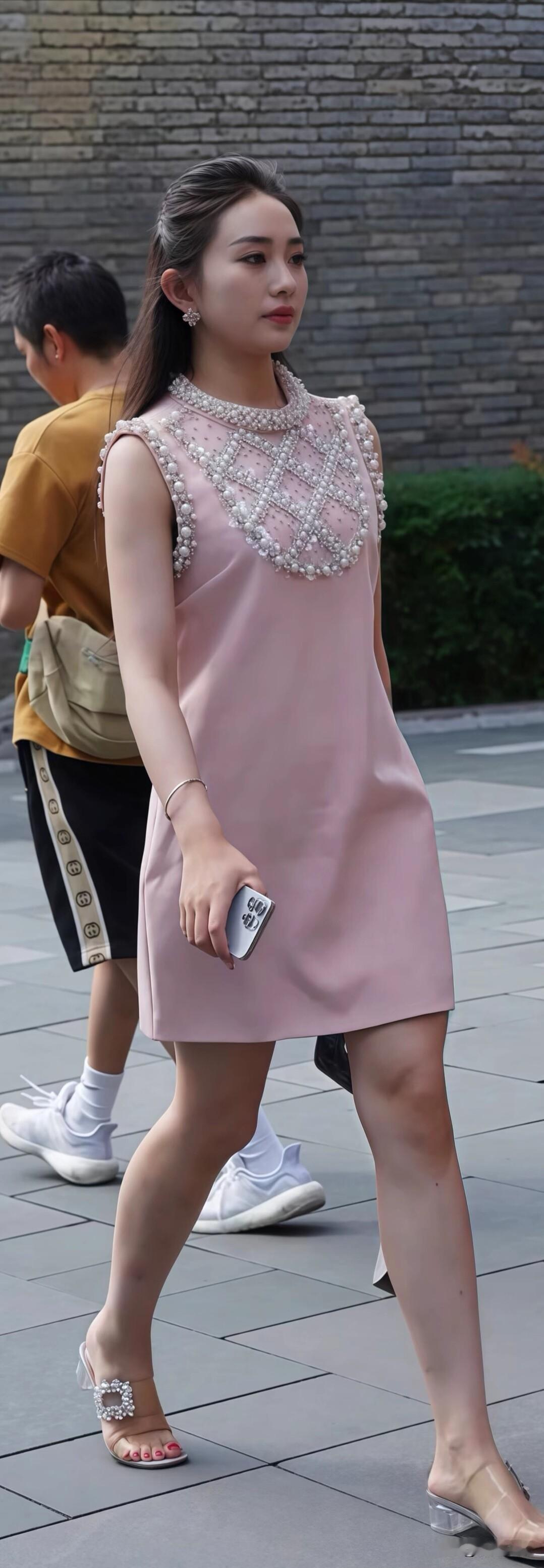 街头偶遇粉色珍珠连衣裙小姐姐,精致优雅。她手持手机,脚踩透明钻扣凉鞋,气质温婉,是都市里的一抹亮色。