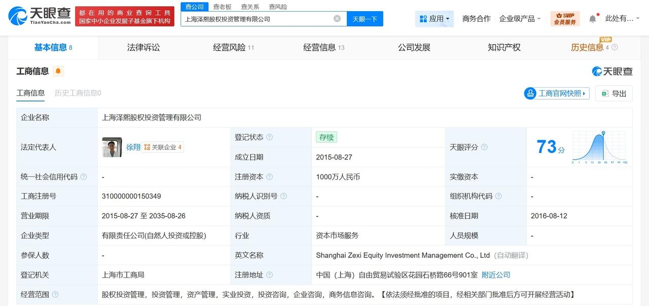 徐翔名下泽熙股权投资管理公司被吊销执照 徐翔名下一公司被吊销执照 天眼查App显示,近日,上海泽熙股权投资管理有限公司因公司成立后无正当理由超过六个月未开业的,或者开业后自行停业连续六个月以上,被上海市市场监督管理局吊销营业执照。 上海泽熙股权投资管理有限公司成立于2015年8月,法定代表人、执行董事兼总经理为徐翔,注册资本1000万人民币,经营范围为股权投资管理、投资管理、资产管理、实业投资、投资咨询、企业咨询、商务信息咨询,由郑素贞、徐柏良共同持股。 天眼查信息: