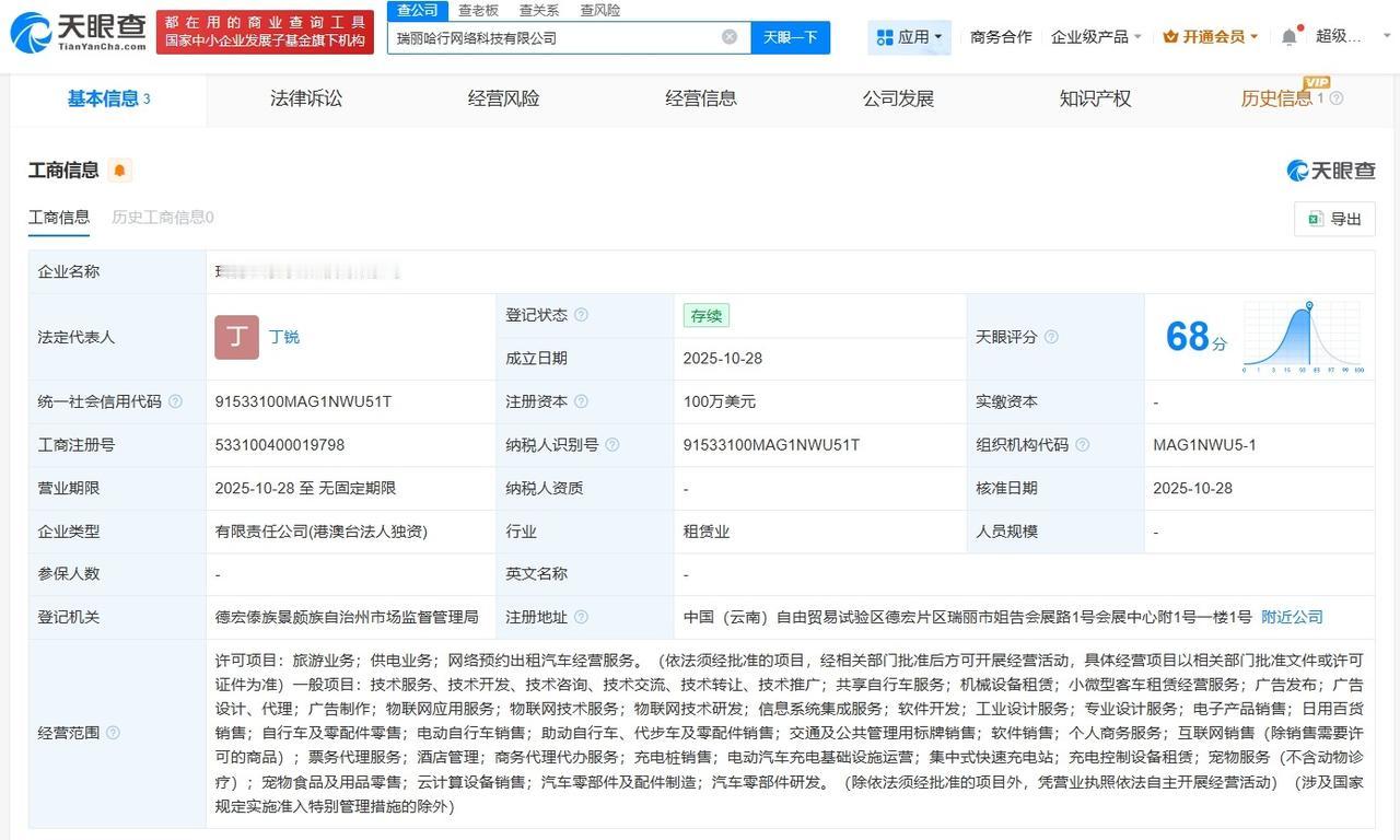哈啰在瑞丽成立网络科技新公司注册资本100万美元 天眼查App显示,近日,瑞丽哈行网络科技有限公司成立,法定代表人为丁锐,注册资本100万美元,经营范围包括旅游业务、供电业务、网络预约出租汽车经营服务等。股东信息显示,该公司由哈啰出行旗下Hong Kong RideTech Limited全资持股。 天眼查信息: