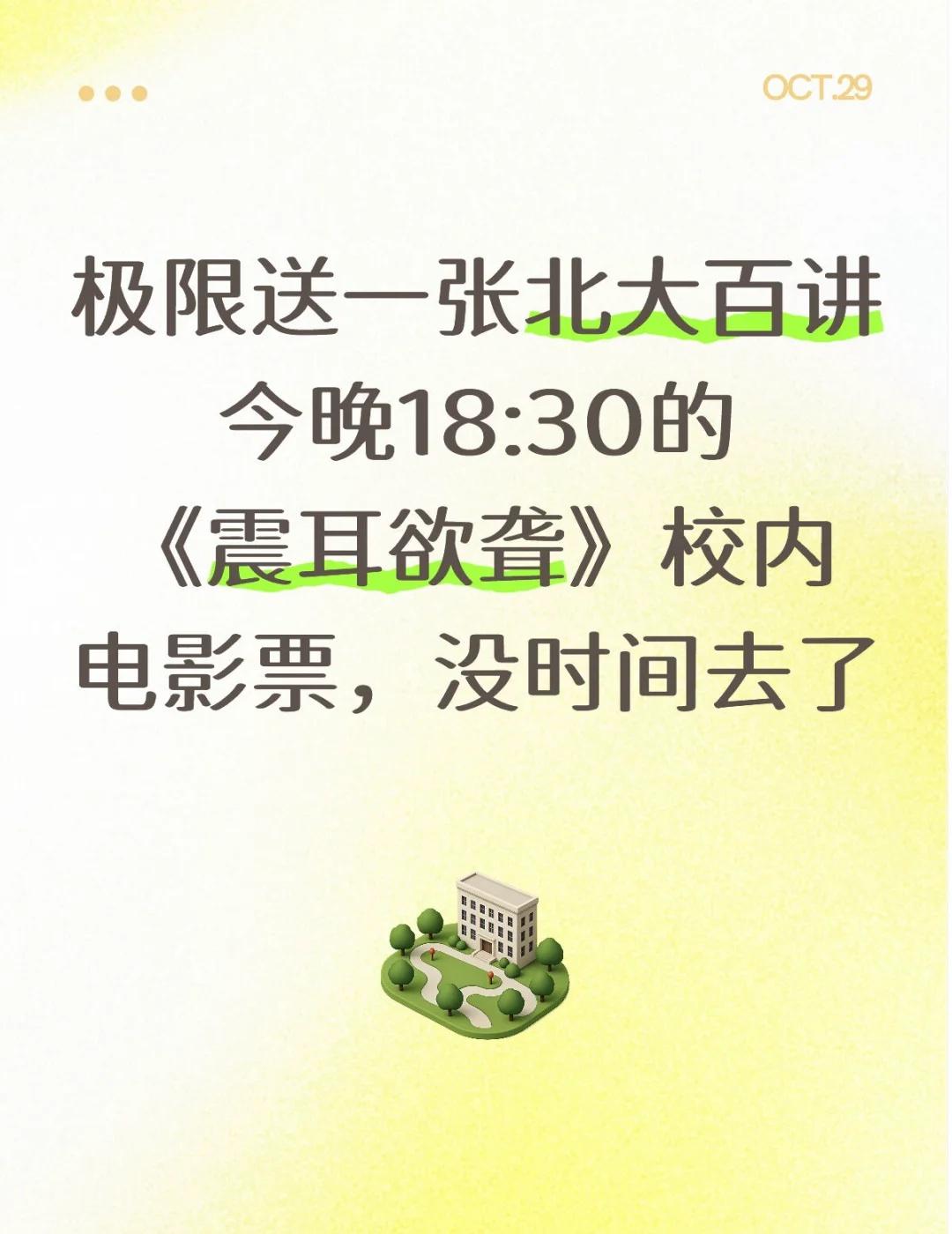 送北大百讲《震耳欲聋》电影票 极限送一张北大百讲今晚18:30的《震耳欲聋》校内电影票,没时间去了北大 北京大学 北大百讲 震耳欲聋 檀健次