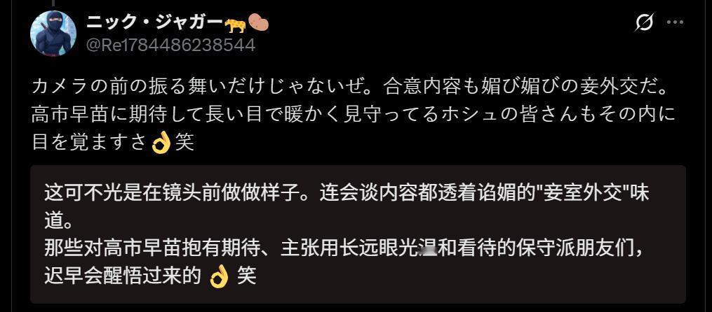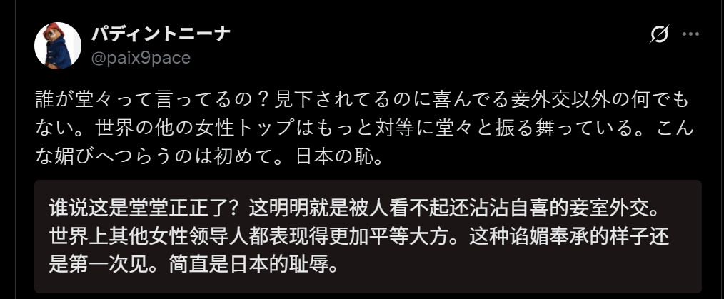 🔻网友分享:现在日本网民反过来骂高市早苗是“妾室外交”。