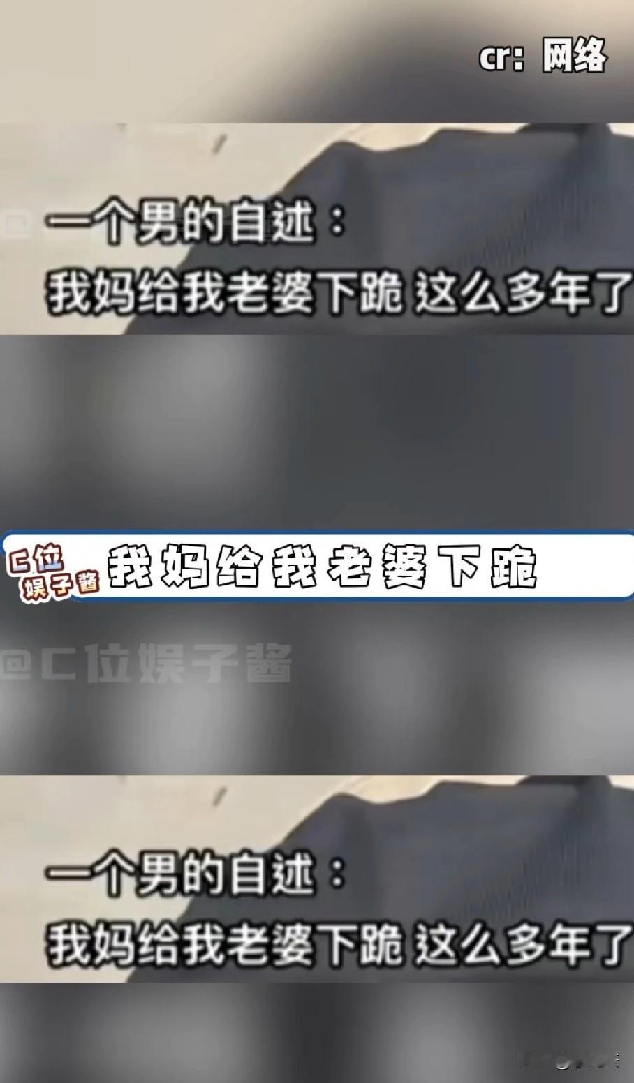 “这届网友太清醒了!”一男子在网上指责,自己妈被儿媳逼的下跪,这么多年了,每次一想到这个画面,就再也和媳妇亲近不起来。网友:婆婆的目的达到了,就这么一跪,儿子一家被搅的不得安宁。 男子和媳妇吵架,本来两个人吵完也就没事了。夫妻两在卧室吵,婆婆在旁边屋里照顾孩子。 过了一会婆婆走上去劝架,对儿媳说儿子不容易,求儿媳不要埋怨儿子,儿媳也没当成一回事。 没想到婆婆却突然跪下了,对儿媳说都是自己的错,甚至儿子要去拉婆婆起来,婆婆也倔强的坚决不起。 媳妇看着突然的一幕,不知所措,婆婆这么一跪,不论发生了什么都像是自己的错,这样的道德绑架让她很气愤。从那以后,夫妻两的关系再也回不到以前,丈夫的态度改变了很多,说话都变得很暴躁。 而在男人看来,生我养我的妈妈,居然受到如此屈辱,对媳妇也充满了恨意。 之前网友所说,结婚前夕,准婆婆为让儿媳美美的走路,用毛巾把家门口的泥泞吸干净,所有的左邻右舍和亲朋好友都看着,大力赞扬婆婆对儿媳的照顾。 只是别人不知道的是,其实用一块红毯铺起来也可以吸水,或者用石灰垫一下也能吸水。但是婆婆都不愿意,非要用毛巾一点一点吸,让儿媳记住婆婆的好。