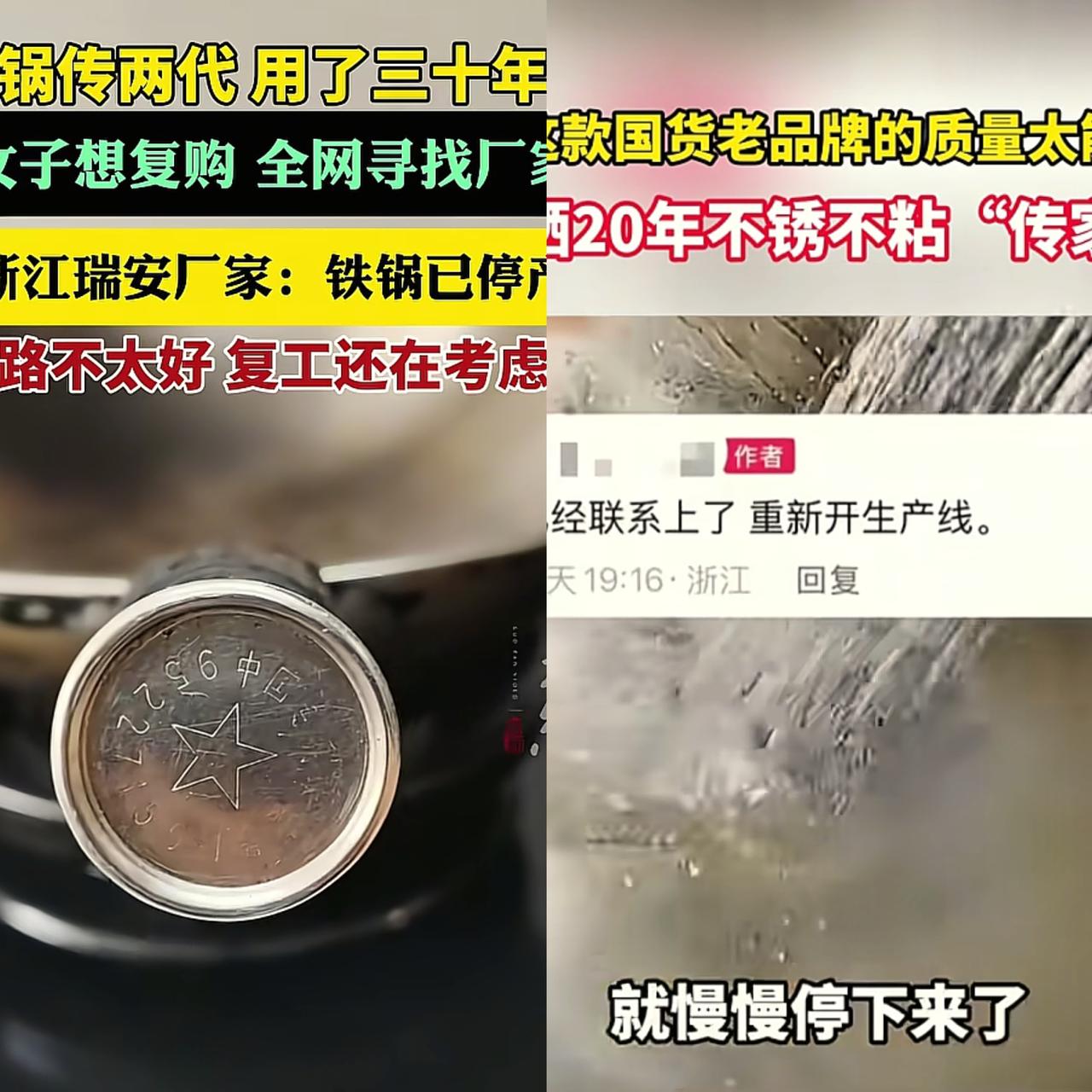 好消息,浙江瑞安铁锅厂准备复工了,大家有地方买锅了。 铁锅厂的负责人说,其实他们厂一直都在,只是不生产锅了, 改为生产自动化设备了。 想当年他们的锅多牛啊, 从纯手工一锤一锤敲, 到后来机器升级, 质量从来没掉过线, 可惜没扛住市场波动停了产。 还好网友的热情被厂长看到了, 果断“听劝”重启生产线, 还承诺尽量保留老工艺、严控质量。 说真的, 这种老厂子根本不用打广告, 当年攒下的好口碑就是最好的招牌。 现在大家就认这种实在东西, 有情怀又靠谱, 只要质量还是老样子, 肯定不愁卖。 你以前用过这家的铁锅吗? 要是开售, 你会第一时间下单支持不?