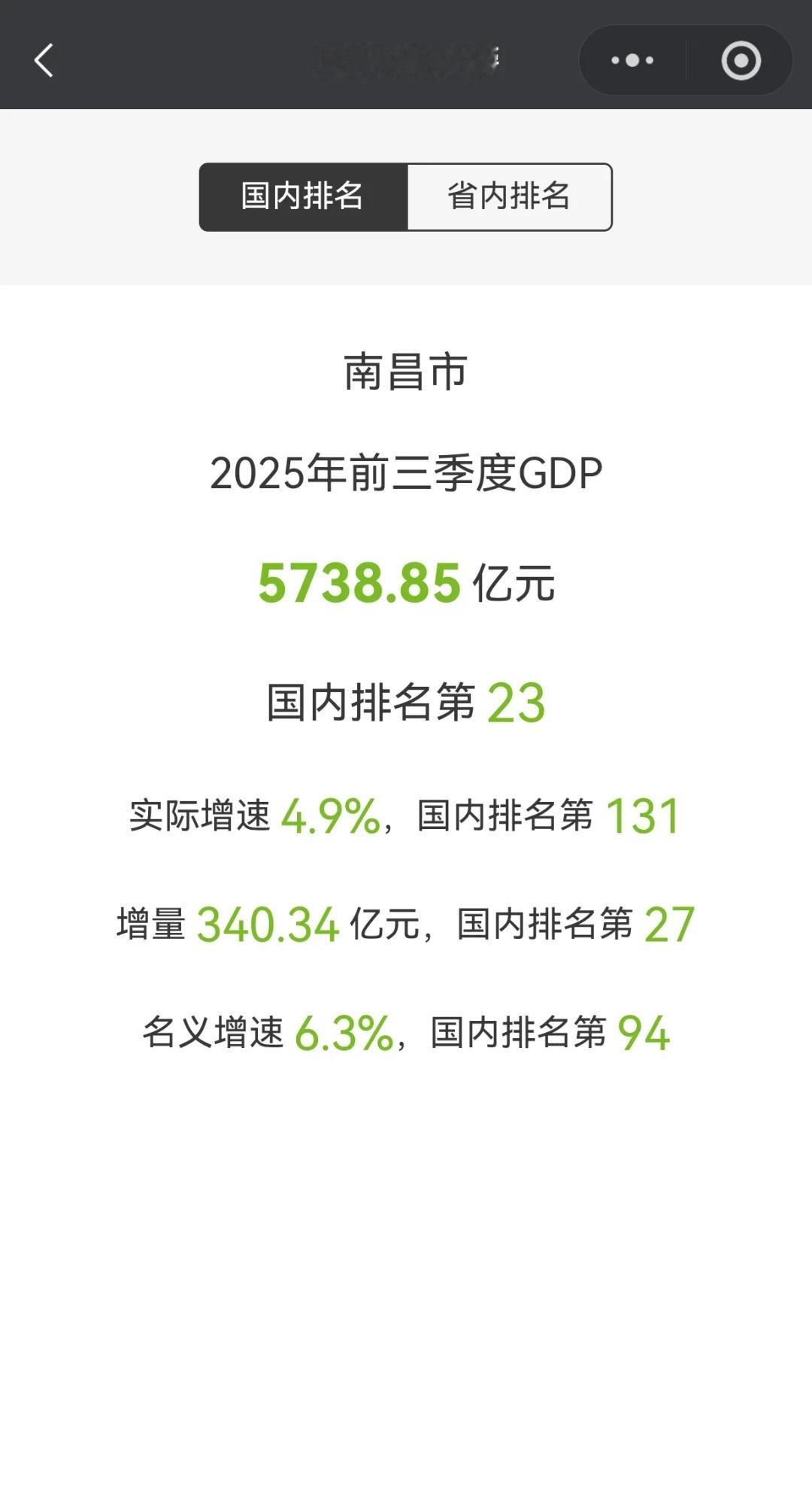 南昌市前三季度GDP出炉5738亿,增量340亿 GDP gdp 江西 南昌 武汉 长沙 广州 上海 郑州