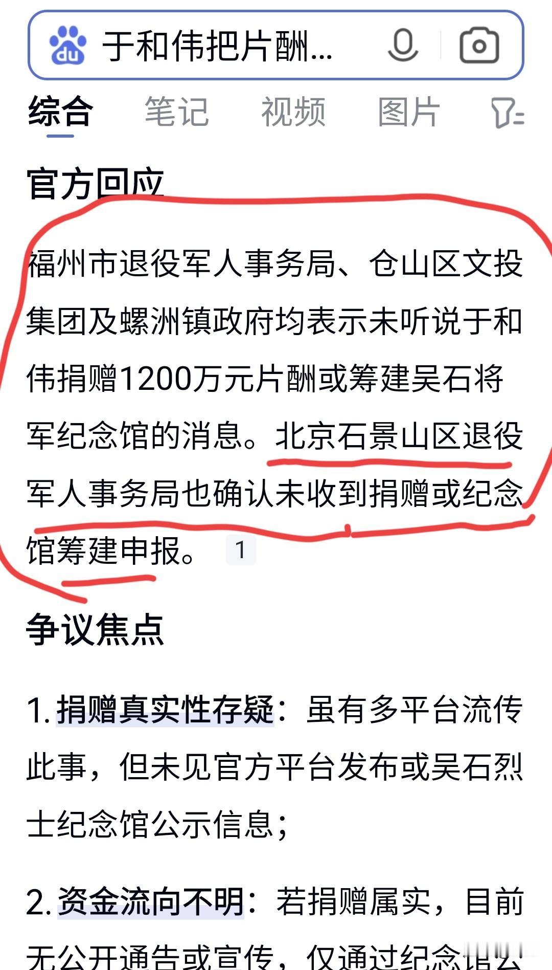 于和伟真的把1200万片酬捐了吗? 我特意去百度官方查证一下告诉你们目前查到结果。 官方回复: 福州市退役军人事务局、仓山区文投集团及螺洲镇政府均表示未听说于和伟捐赠1200万元片酬或筹建吴石将军纪念馆的消息。北京石景山区退役军人事务局也确认未收到捐赠或纪念馆筹建申报。 这就是最真实官方回复。 我们可以等待最新官方回复…… 目前并没收到于和伟捐助任何钱款。