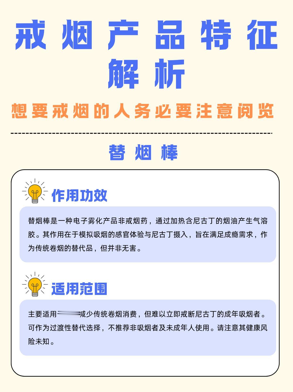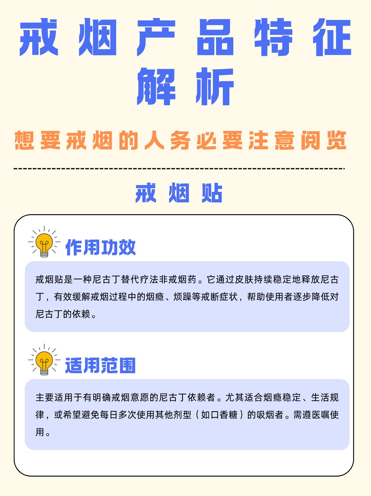 适用范围:适用于有明确戒烟意愿的成年吸烟者,能有效减轻尼古丁依赖及戒断症状,减少吸烟快感,帮助使用者克服生理和心理依赖,实现成功戒烟。