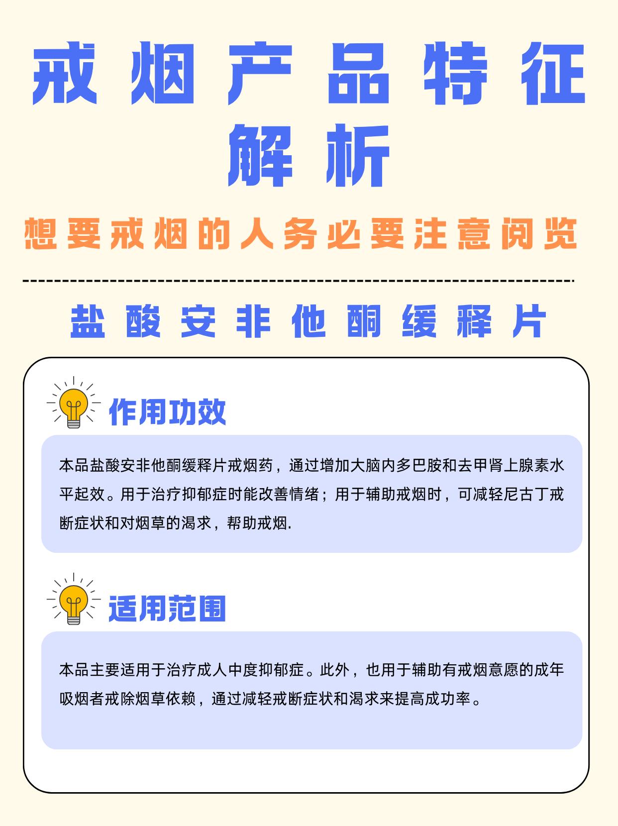 作用功效:通过增加大脑内多巴胺和去甲肾上腺素水平起效,用于治疗抑郁症时可改善情绪;用于辅助戒烟时,能有效减轻尼古丁戒断症状和对烟草的渴求,帮助戒烟。