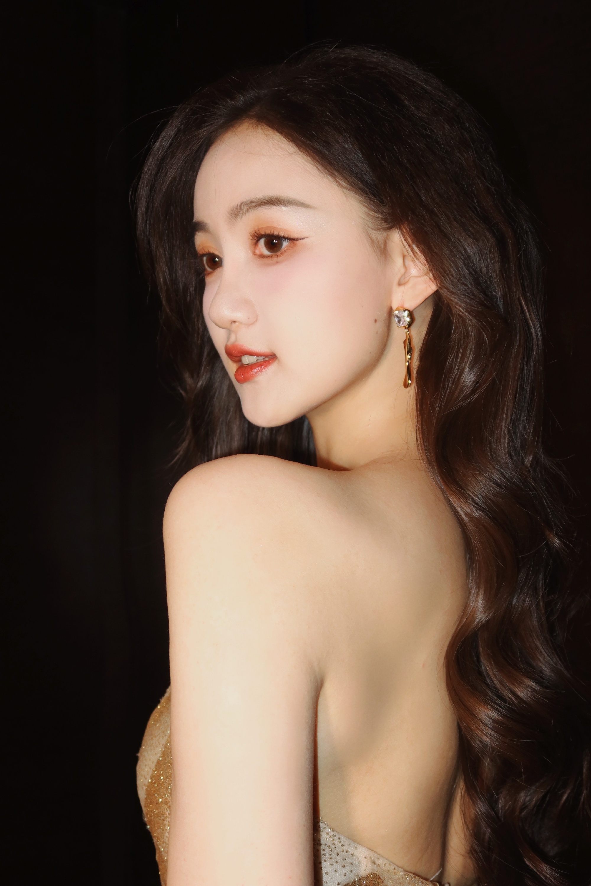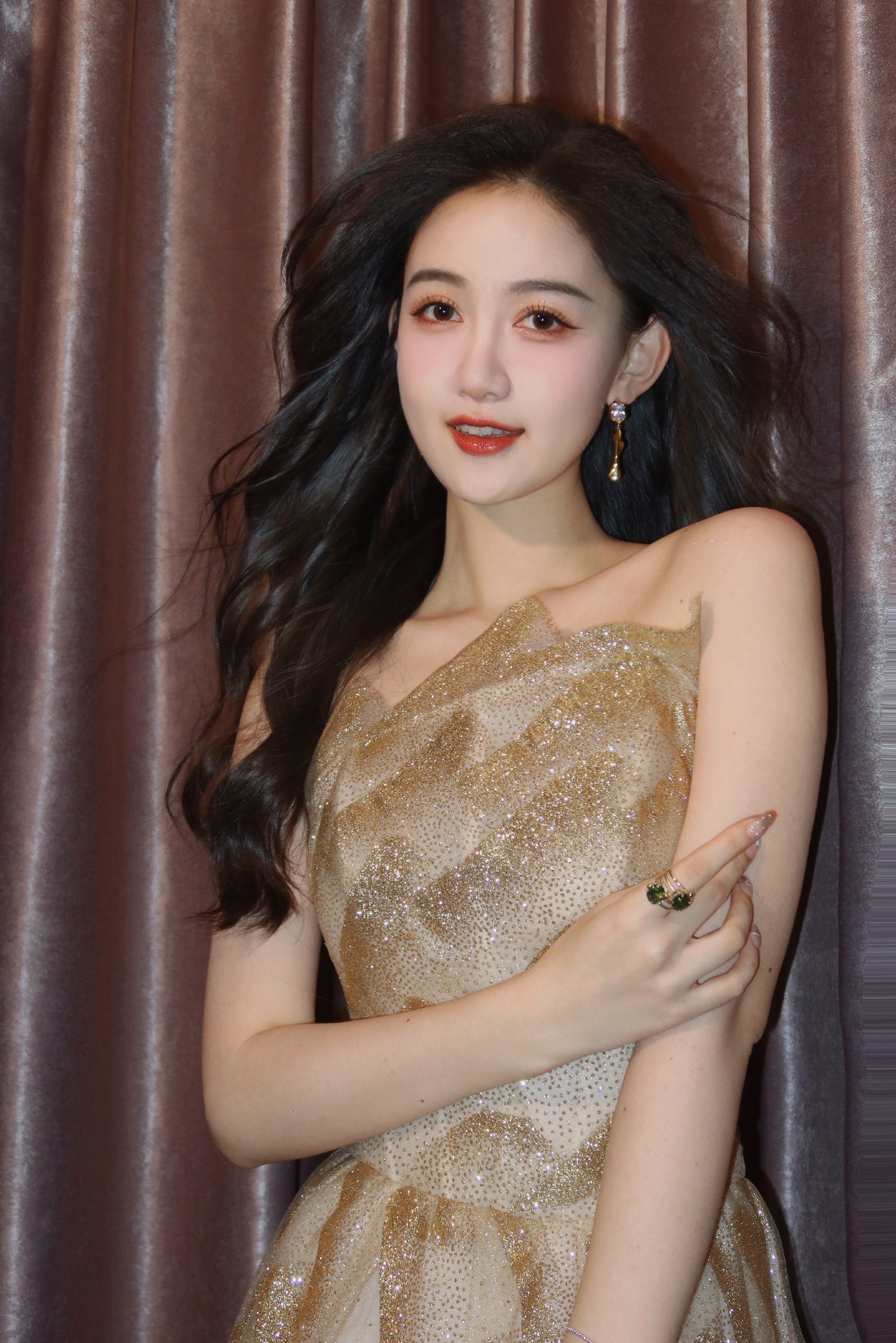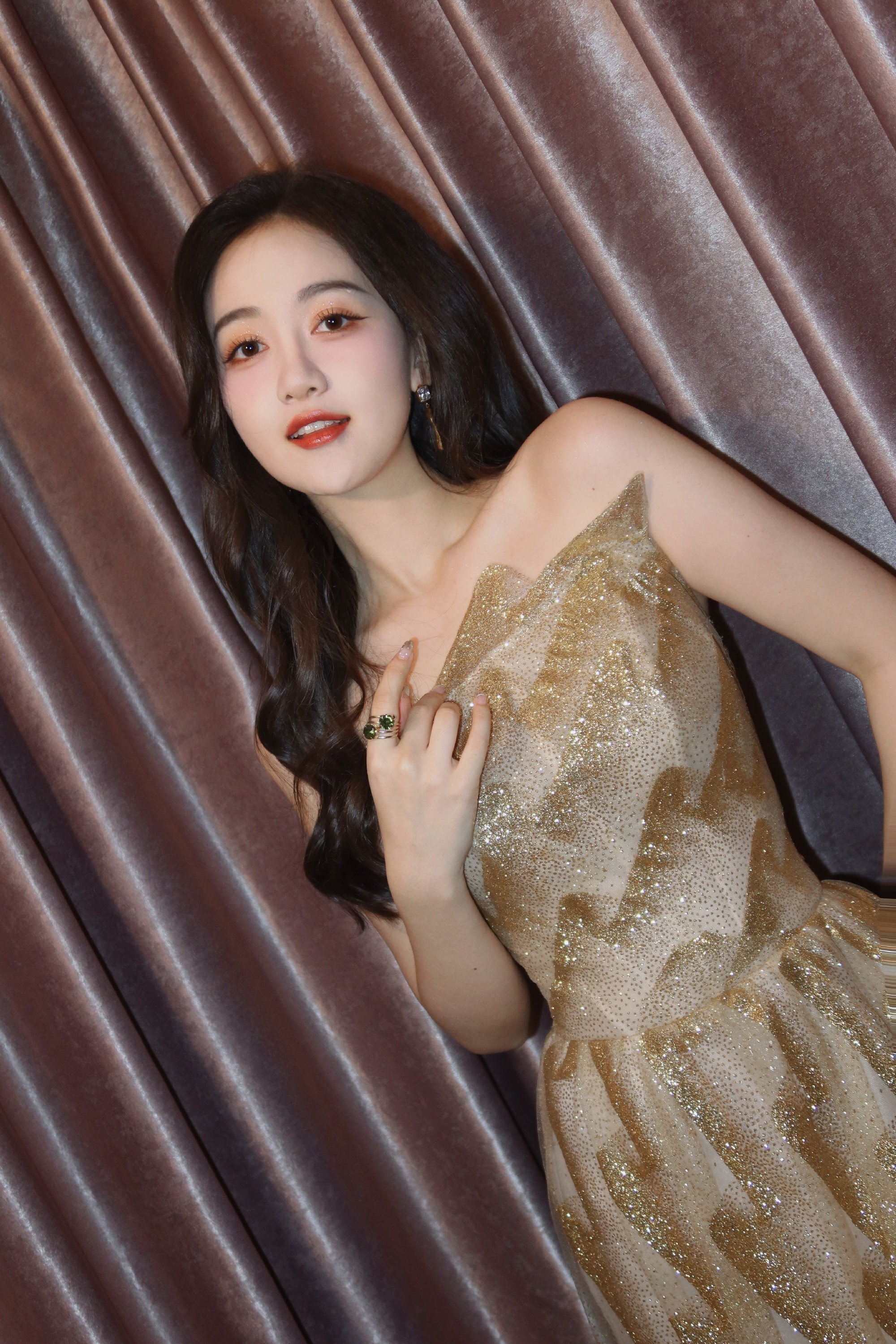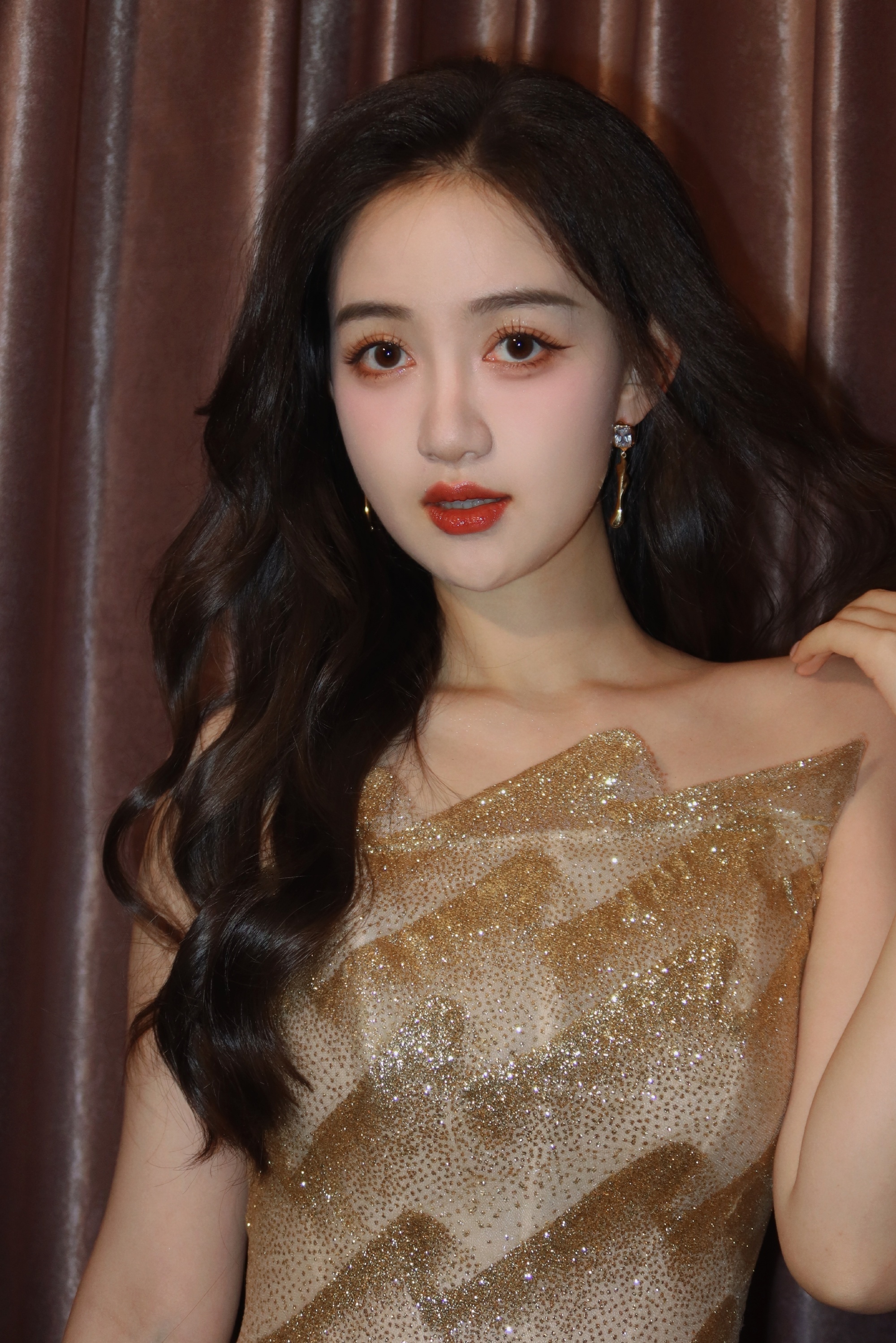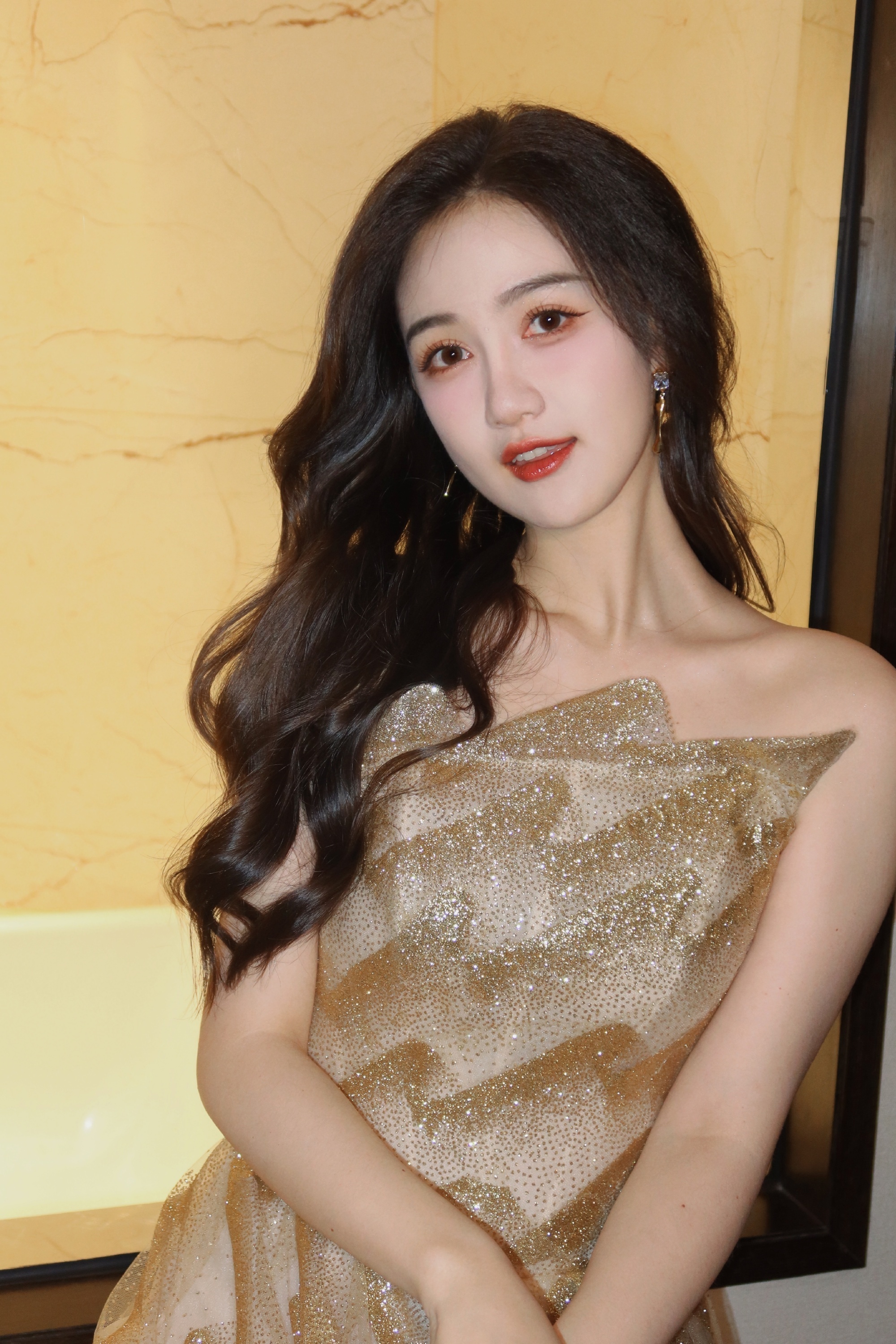 马萱卷发红唇金色礼裙,甜笑怡人,山河入梦