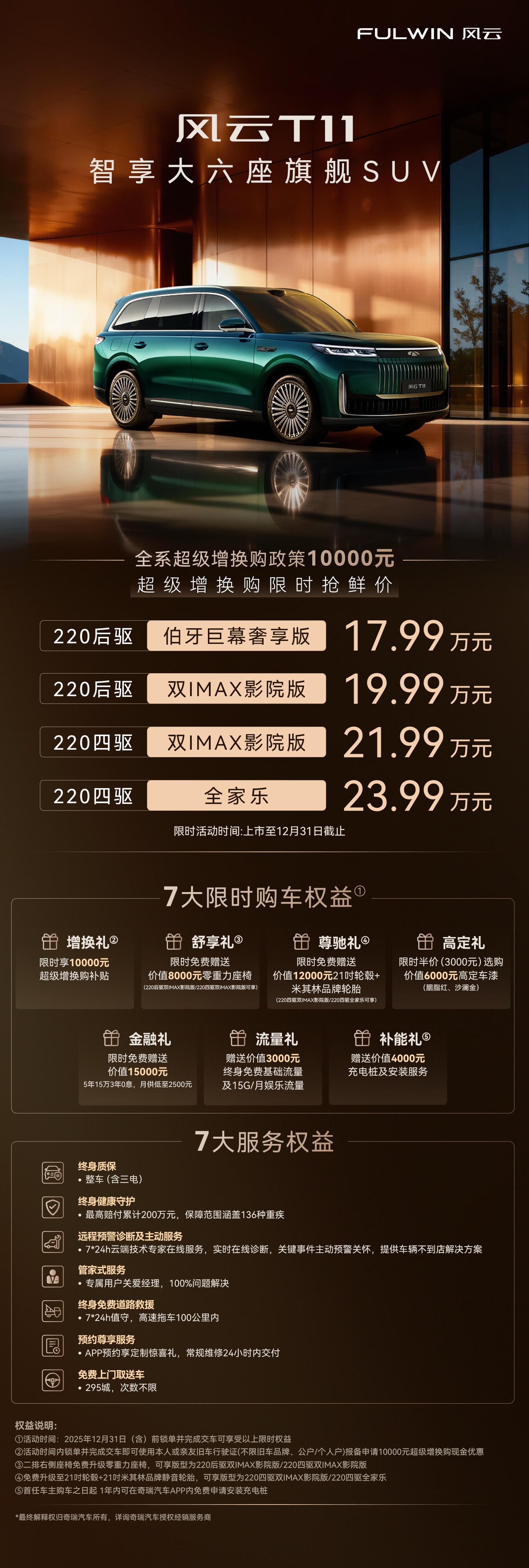 智享大六座旗舰SUV风云T11限时抢鲜价17.99万元起,7大限时购车权益+7大服务权益!风云T11上市让百万豪华触手可及
