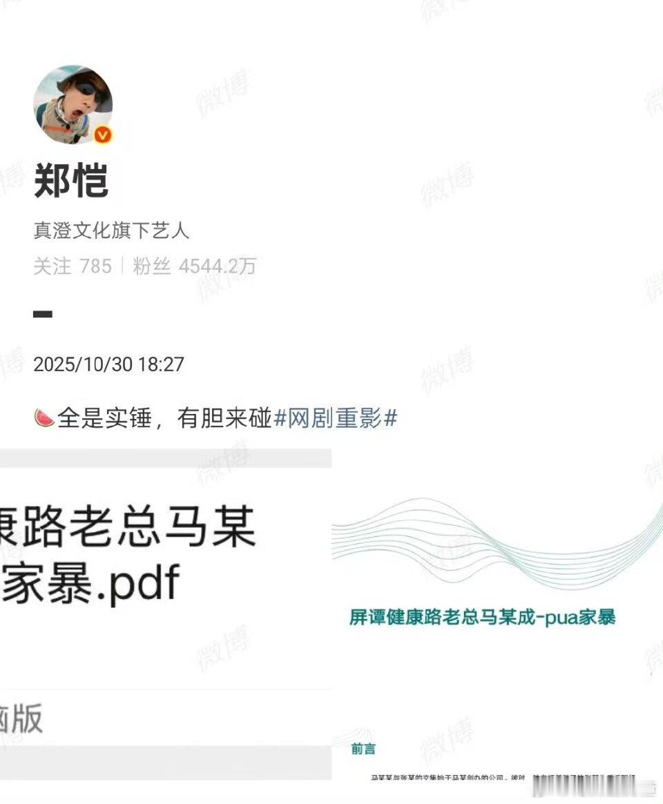 郑恺当上瓜主了 现场见证郑恺放瓜!微博发聊天记录PDF曝马伟成恶行,瓜料十足,吃瓜路人追不停,还急催《网剧重影》别等跪求才加更!