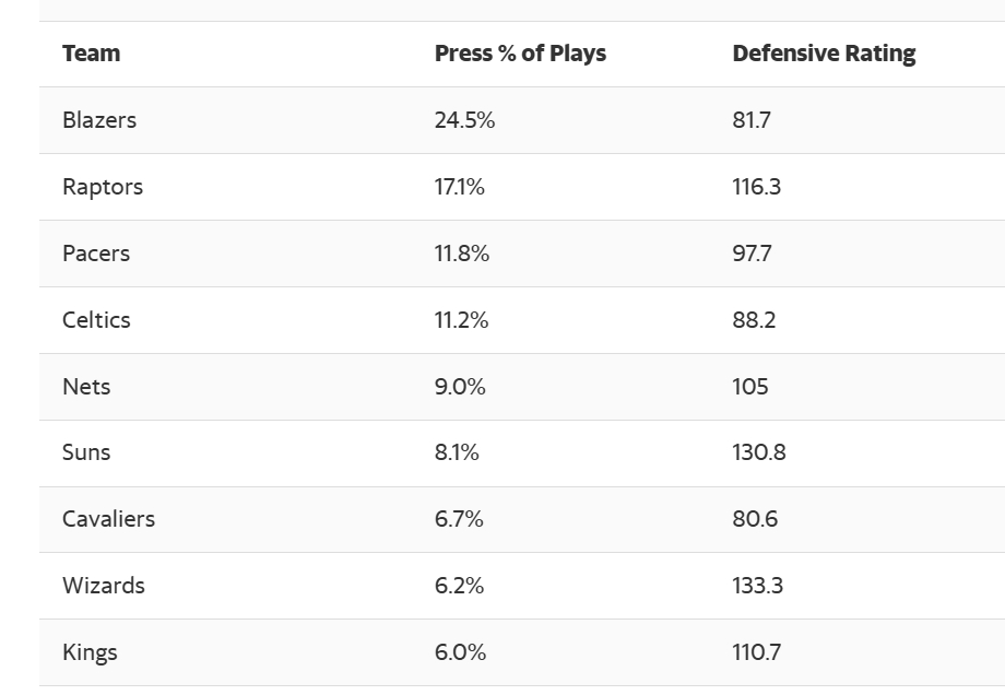 而这方面最激进的球队就是开拓者了,24.5%回合的全场紧逼,每百回合丢81.7分