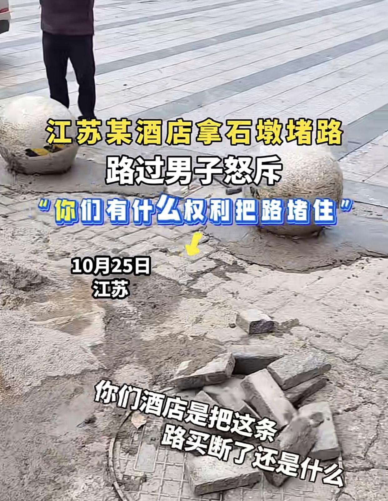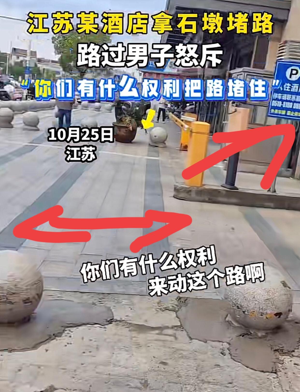 大家来评评!江苏一男子质疑酒店在人行道非法设置大石墩,认为阻碍别人通行,酒店没有权力堵住! 有问题吗,人家为什么要堵?因为酒店租了整栋楼作为营业场所,铺面大门口及前后左右一百米都是酒店范围,包括在马路边停车也不行。再说了,这是酒店自己的地下停车场出入口,堵住也是基于安全考虑。 这本来就是人行通道,石墩的间距显然是为了阻止车辆进出而不是拦行人的,酒店此举在力所能及的范围内有效防止机动车开上人行道,保障了行人和非机动车的通行自由和安全,这个做法没毛病!你若在这里摆个摊,人家都有权力给你撵走,毕竟那是人家酒店自己的地盘。