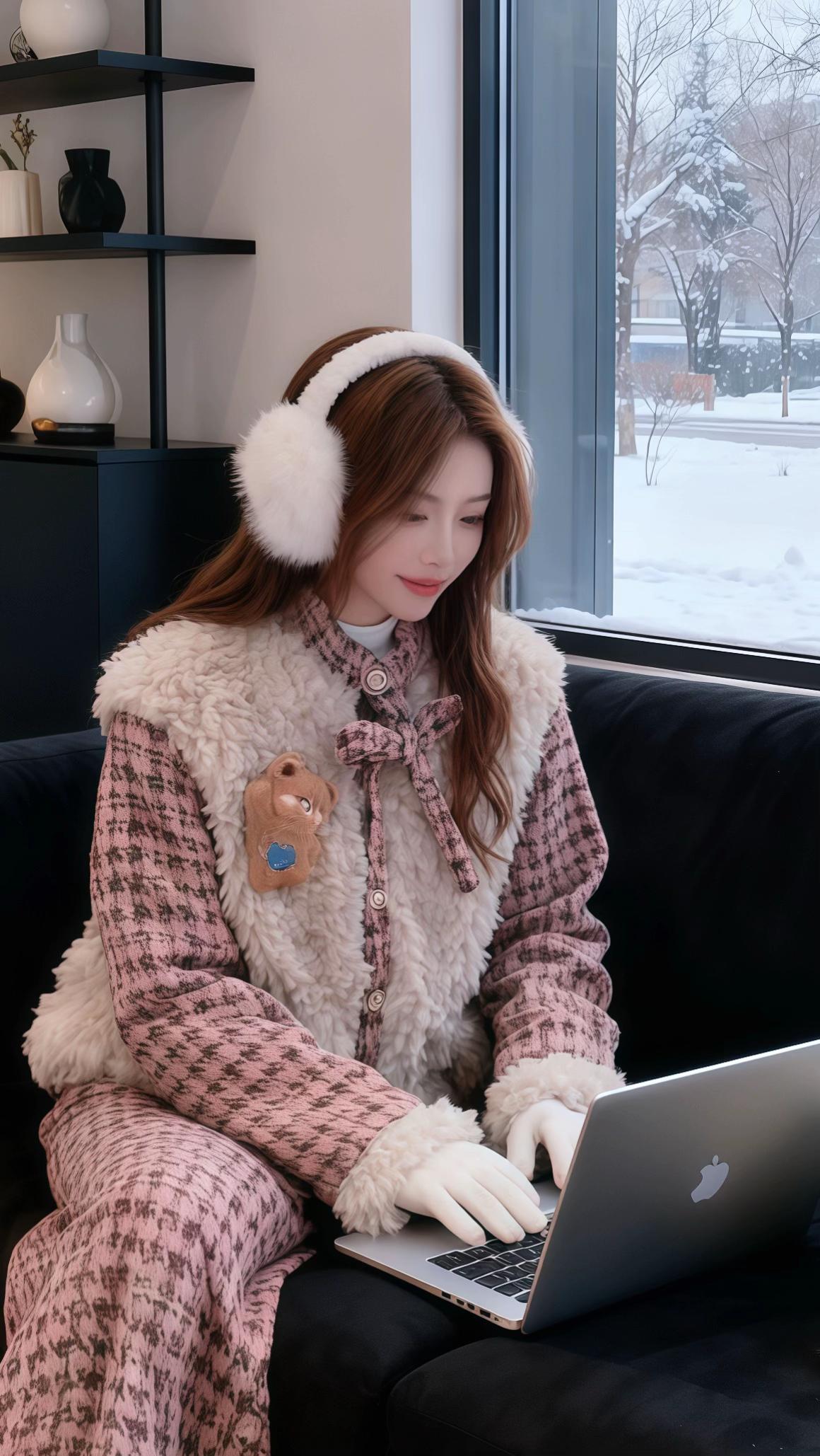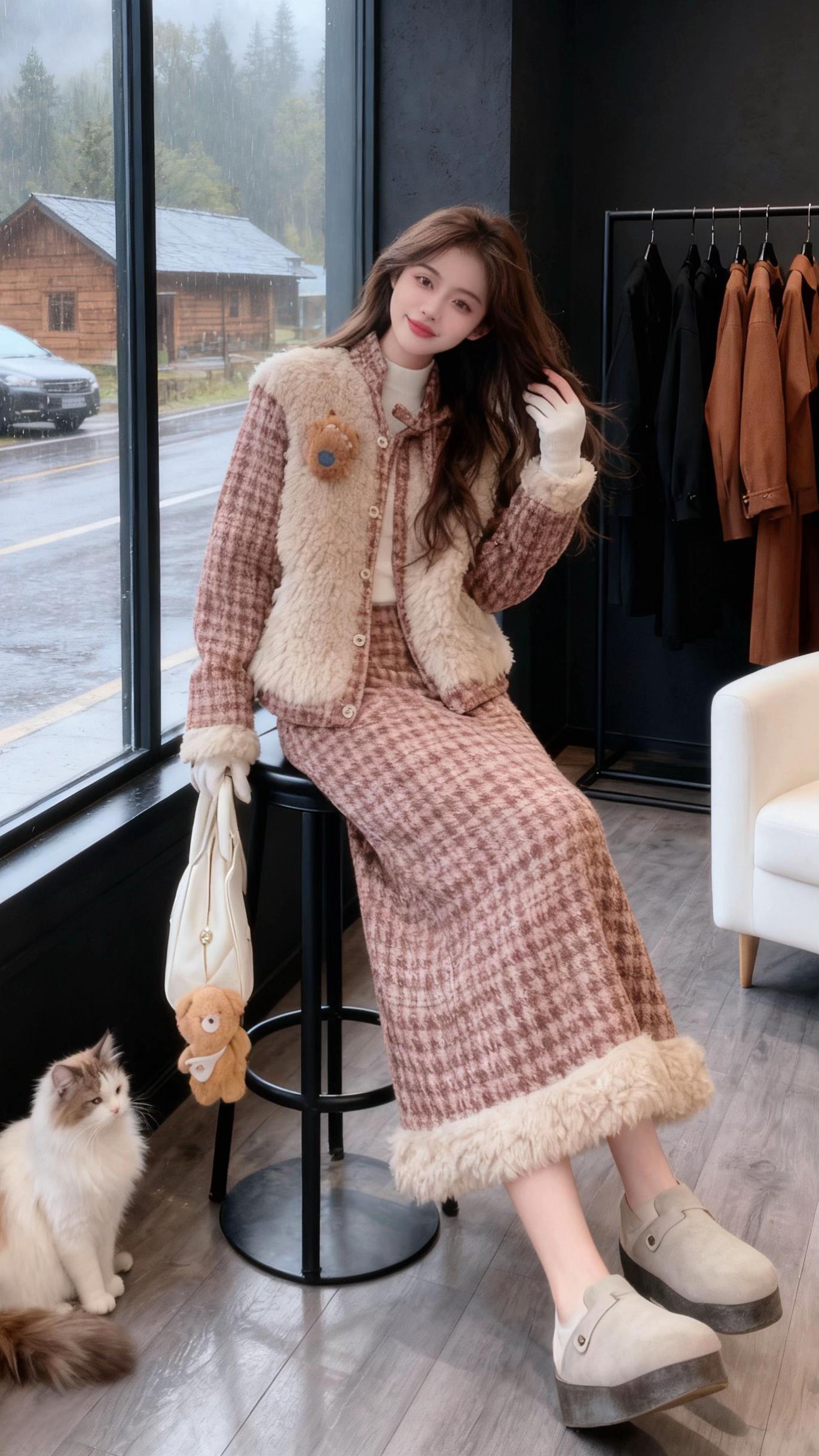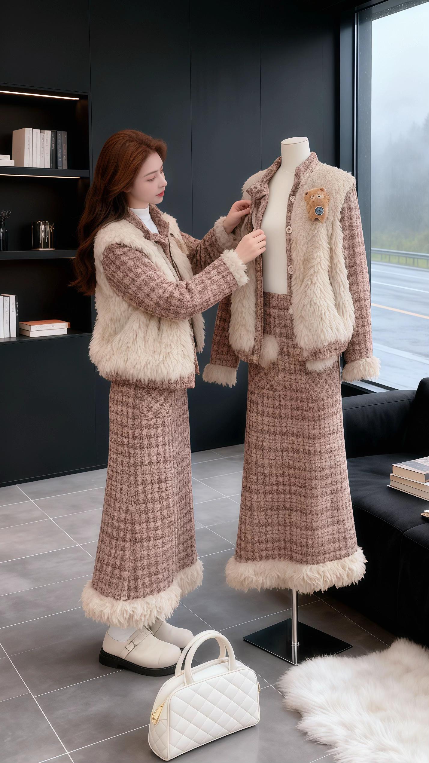 一身格纹毛绒套装,是她从试衣间里挖到的宝藏——毛绒拼接的外套软乎乎的,像把云朵穿在身上,格纹半裙下摆的毛绒边随着步伐轻轻晃,每一步都踩着冬日的温柔节拍。搭配同系列毛绒马甲,再别上小熊胸针,可爱值直接拉满。