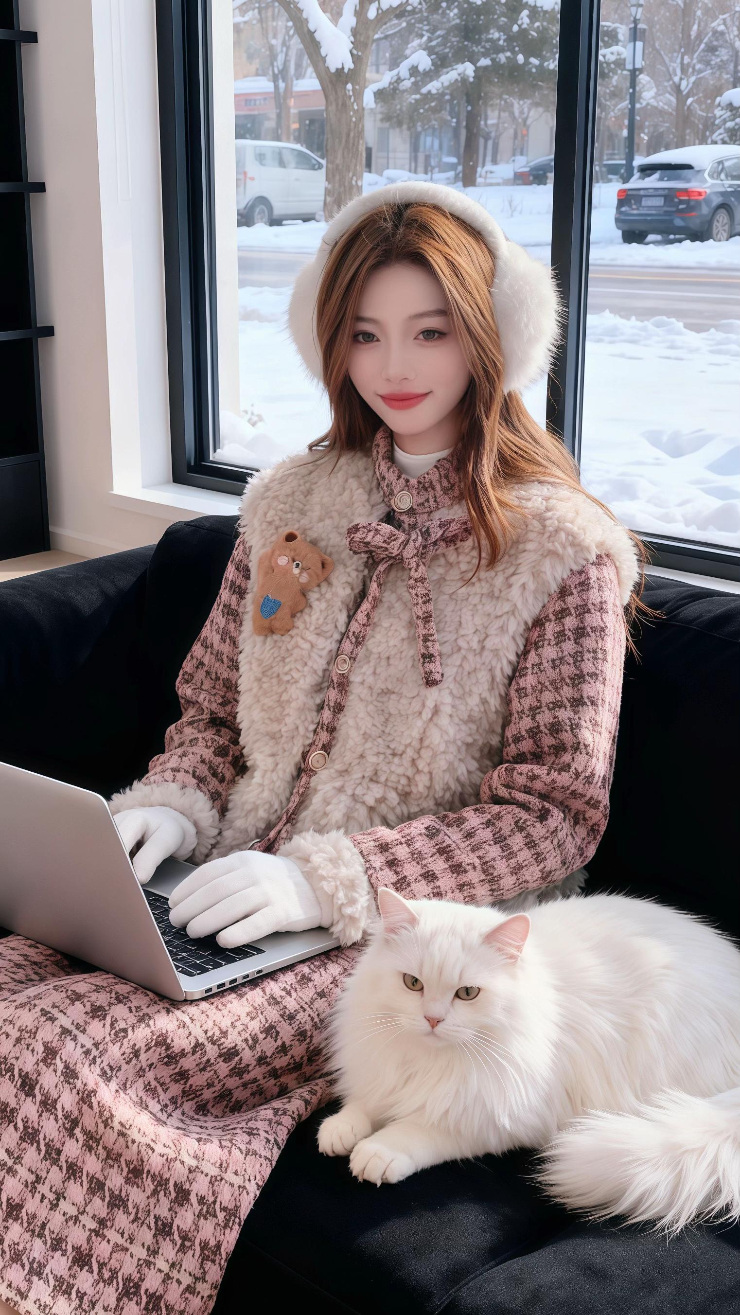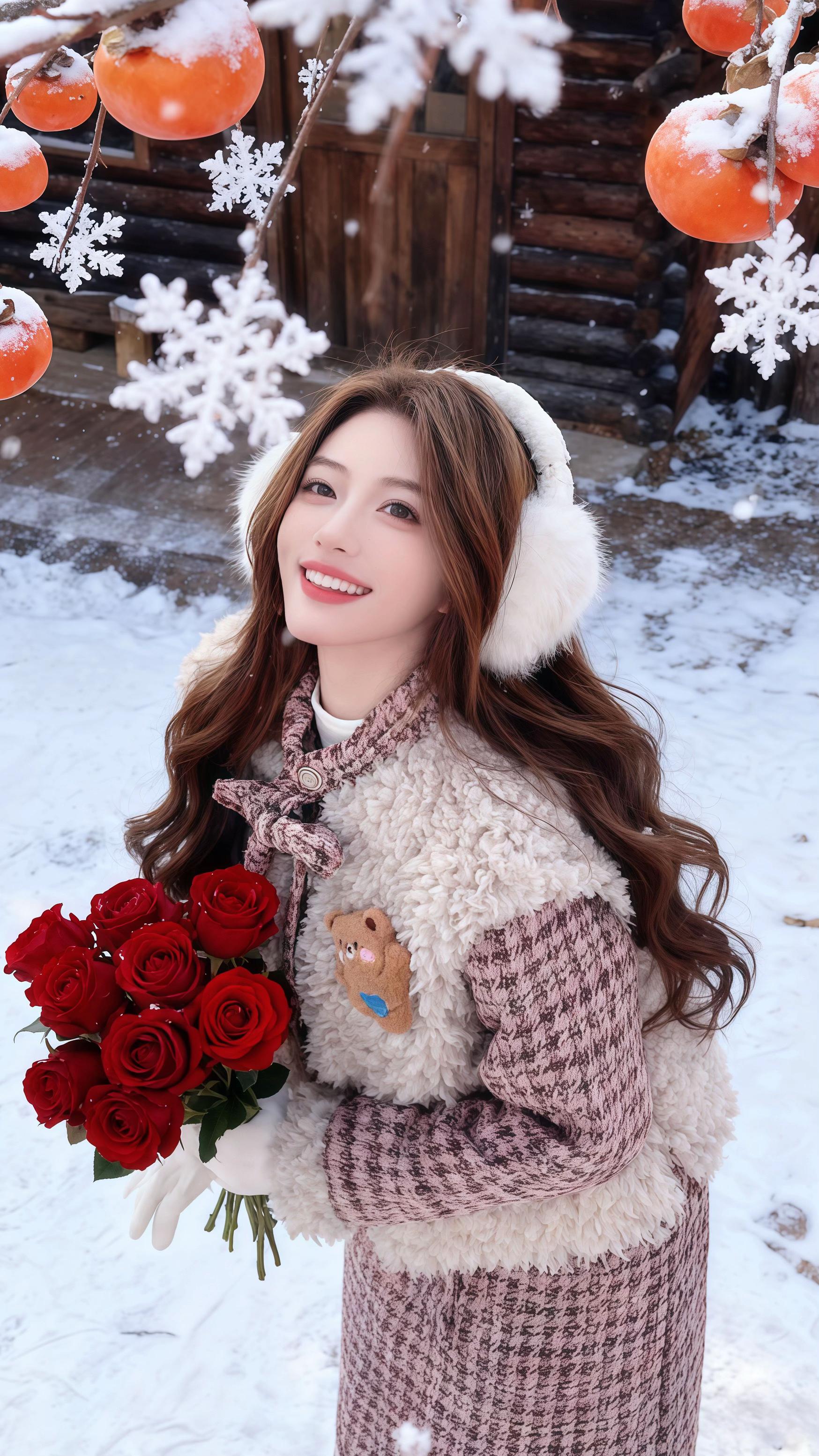 咖啡馆里,她戴着毛绒耳罩敲键盘,身旁的白猫蜷成一团雪;服装店的落地窗前,她拎着小熊挂饰的包包浅笑,猫咪在脚边仰头望;雪天的木屋里,她抱着红玫瑰站在柿树旁,毛绒元素与雪景交融,活脱脱从