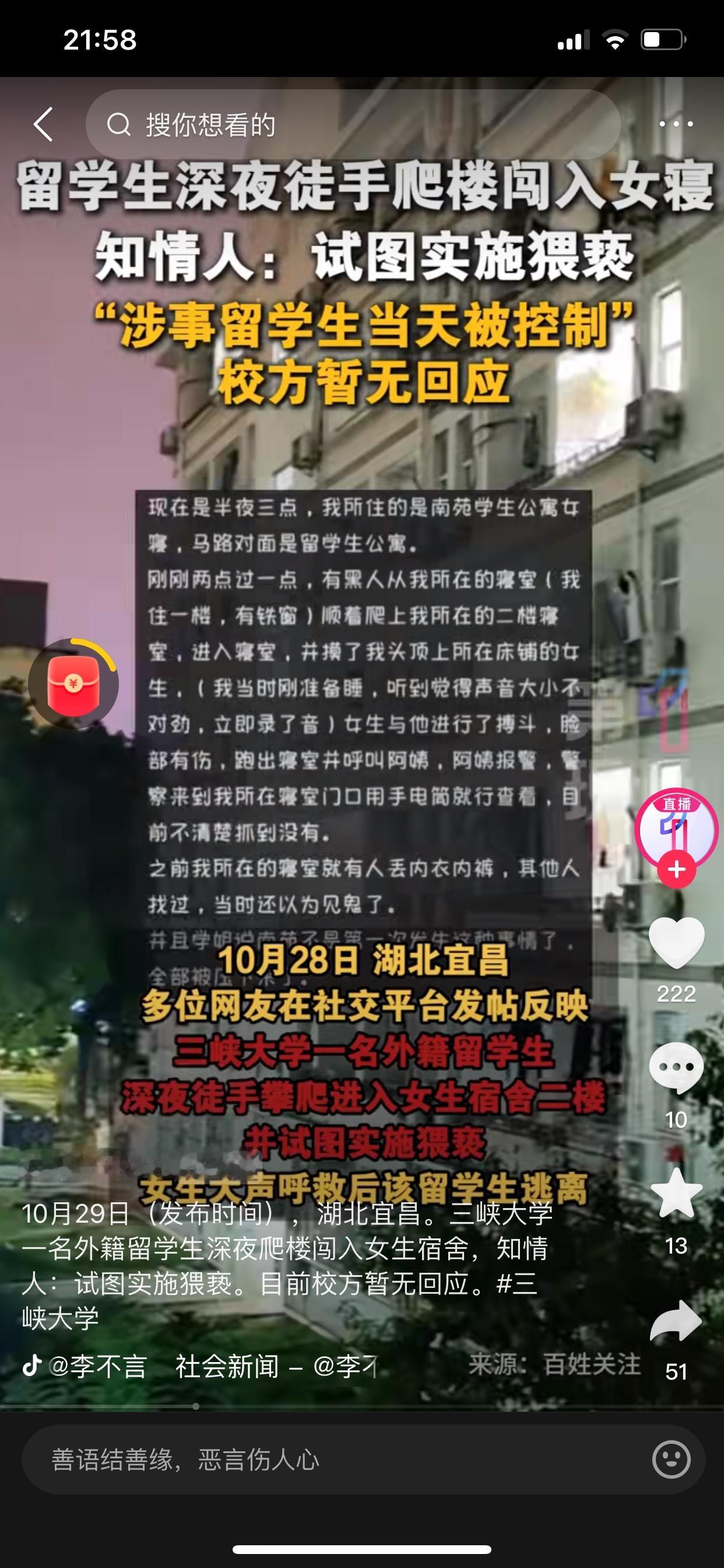 三峡大学女生被猥亵这事不能就这么算了 26号凌晨一名黑人留学生徒手爬到二楼猥亵女生,还好女生睡得不沉,立马就醒了,一楼的女生早就警觉,还录了音,二楼打斗的过程全录了下来 学校知道这事第一时间不是调查,公正处理,而是先解散群聊,禁止议论,打算暗箱处理。 没想到现在的大学生不好糊弄,直接在网上爆料了,学校被迫29号发了通报。 这事之前女生宿舍就经常丢内衣,大家还以为见鬼了,都没想到是被H 鬼偷了。这事必须严查,他有没有同伙,内衣是不是他偷的,他同学为什么不阻止不报警不向学校汇报… 要是那个女生比较胆小没有反抗,或者睡的比较沉,后果不堪设想。留学生不是免死金牌,花钱叫他们过来不是来祸害我们自家孩子的。不管是谁违法犯罪了就必须按照法律处理,判刑遣返一点不能含糊。