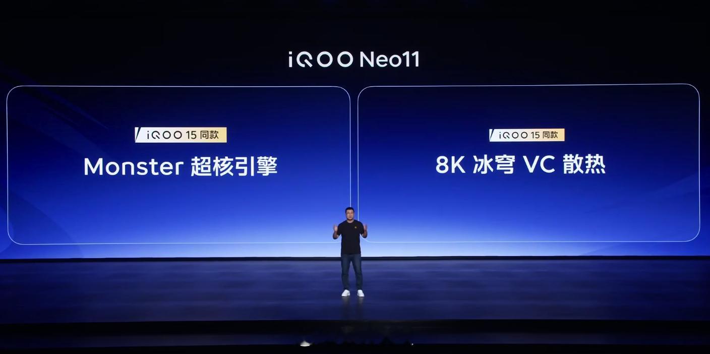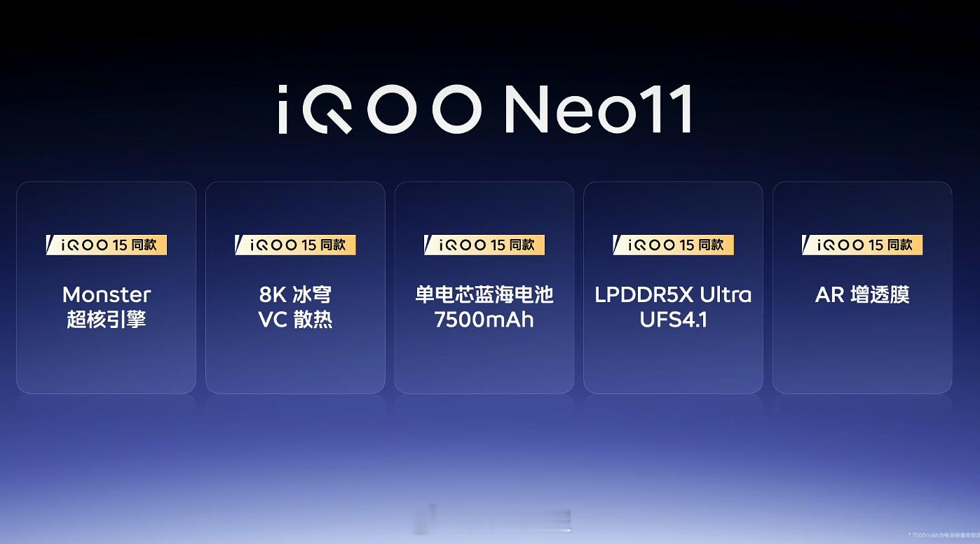 iQOO Neo11发布,很多配置和iQOO 15一样,比如8K冰穹VC散热,单电芯7500毫安时电池,LPDDR5X Ultra,UFS4.1,全链路原彩映射,色温自由调节,全屏熄屏显示等
