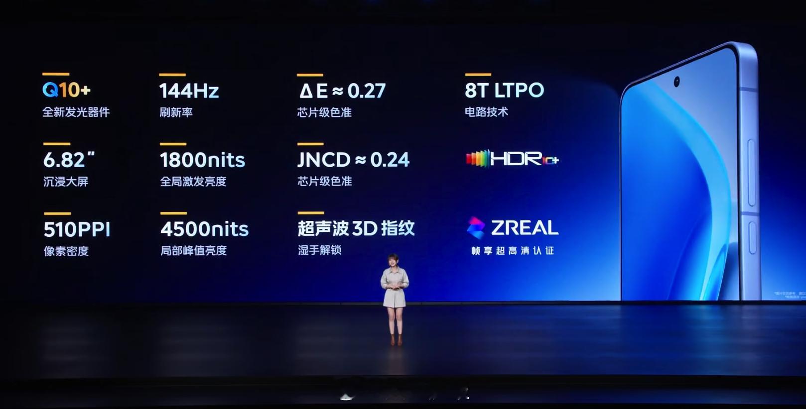 高通骁龙8至尊版处理器,自研电竞芯片Q2,京东方Q10+发光材料,2K分辨率+144hz屏幕,8T LTPO,圆偏振光护眼,超声波3D指纹,瞬时触控采样率3200Hz