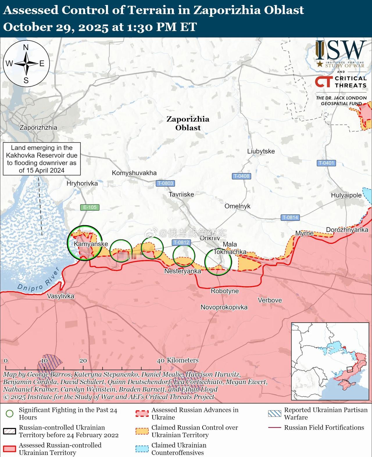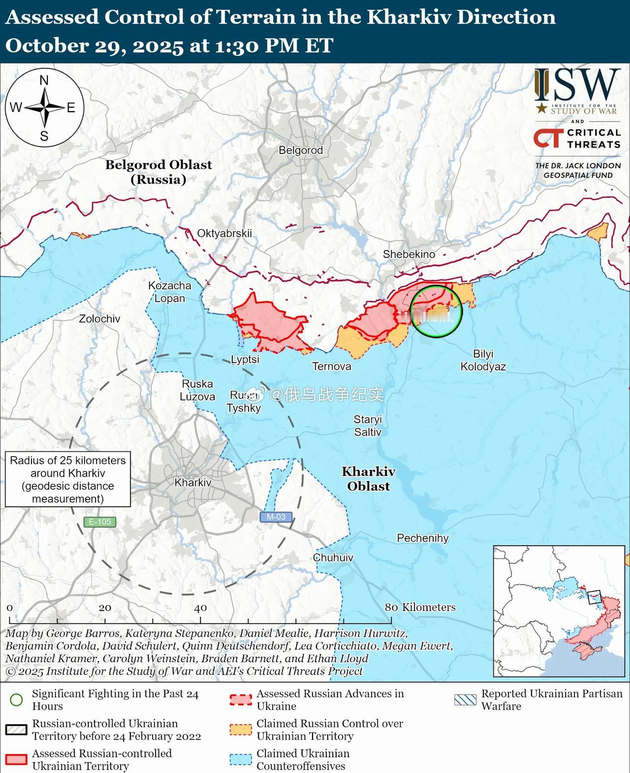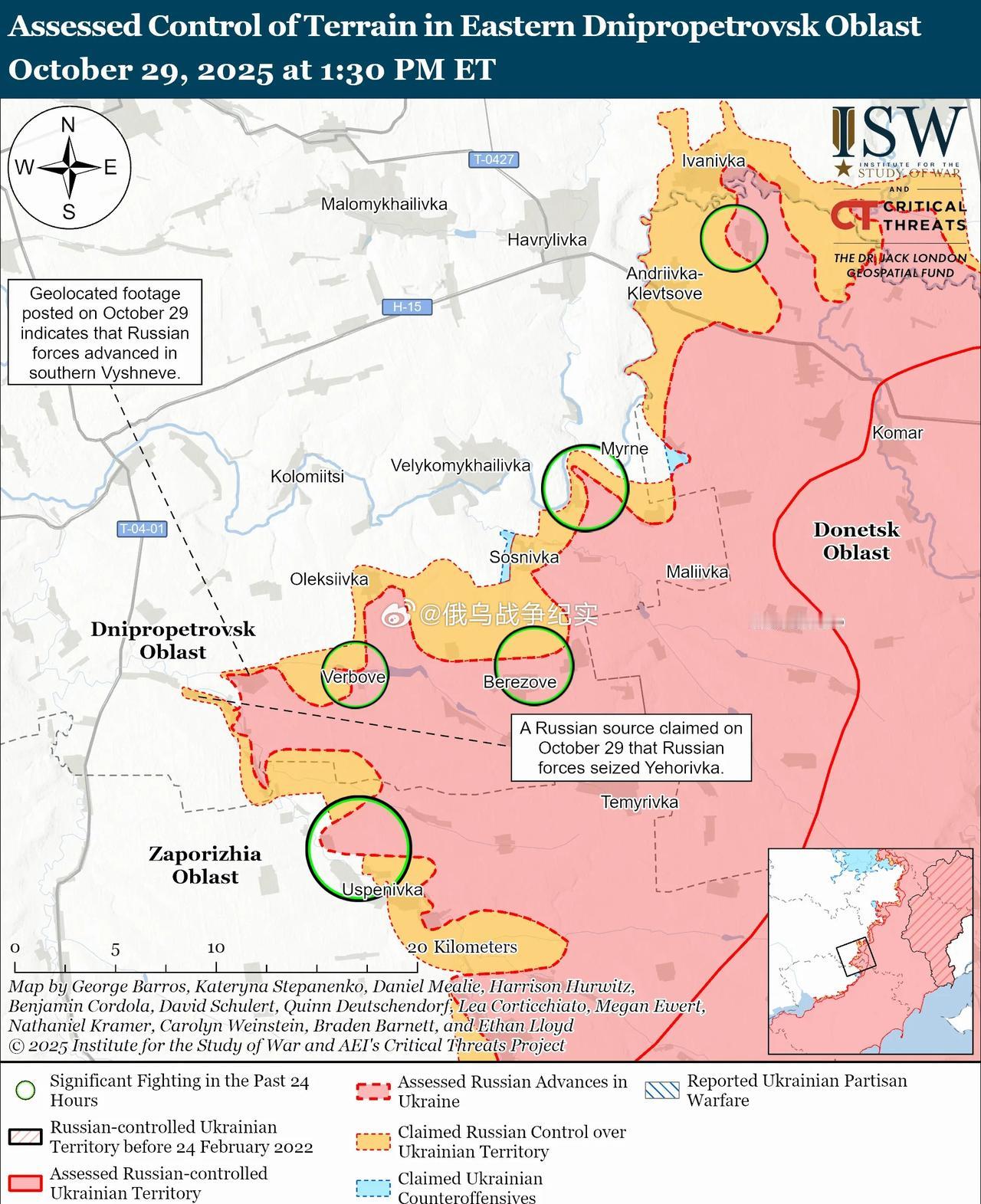 ISW战争研究院关于10月29日俄乌战事要点(文字版) (非战报视频日,会每日更新,涉部分敏感内容会进行删减或脱敏操作) 博主注;ISW战争研究院,对战线情况的记录还是比较准确的,但是在预测战况结果是会有西方倾向,如果是俄粉可以忽略掉看标有预测,推论字段的内容,关注战线字样的即可。 俄乌局势新进展烽火问鼎计划俄乌冲突 一名俄罗斯官员威胁要向委内瑞拉和古巴供应核导弹,并称美国是俄罗斯的敌人。(推论) 俄罗斯总统普京继续宣扬俄罗斯新型核导弹来威胁美国。(推论) 俄罗斯总统弗拉基米尔·普京在波克罗夫斯克表演性地提出了长达数小时的小停火,这可能在一定程度上声称俄罗斯不是和平进程的障碍。(推论) 俄罗斯军队继续向波克罗夫斯克方向推进,但仍不太可能立即瓦解乌克兰包围圈。(推论) 俄罗斯军队可能会花费大量人力和装备来封闭波克罗夫斯克方向的乌克兰包围圈,就像他们在过去 18 个月的波克罗夫斯克战斗中所做的那样。(推论) 据报道,美国最近的一项情报评估得出的结论是,俄罗斯总统弗拉基米尔·普京比以往任何时候都更有决心在乌克兰战争中取得战场胜利,这与俄罗斯高级官员目前的声明一致。(推论) 欧洲官员继续报告欧洲领空遭受空中入侵的情况。(推论) 乌克兰军队向多布罗皮利亚战术区推进。俄罗斯军队在科斯特扬季尼夫卡-德鲁日基夫卡战术区以及库皮扬斯克、波克罗夫斯克和大科米哈利夫卡附近推进。(战线) ———————————————— 延伸——1俄罗斯总统普京在波克罗夫斯克表演性地提出了长达数小时的小停火,这可能在一定程度上声称俄罗斯不是和平进程的障碍。 普京10月29日继续声称,俄罗斯军队已包围库皮扬斯克和波克罗夫斯克的乌克兰军队,并提议停火两到六个小时,以允许记者进入波克罗夫斯克采访。 ISW 并未评估俄罗斯军队目前已包围这两个城镇。普京声称,俄罗斯主要担心乌克兰在拟议停火期间实施挑衅行为,指责俄罗斯。普京可能试图利用微型停火提议来表明俄罗斯对停火感兴趣,特别是在俄罗斯公开拒绝美国总统唐纳德·特朗普提出的在当前前线停火的提议的情况下。
