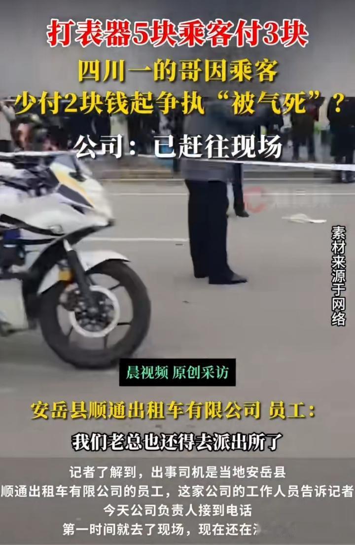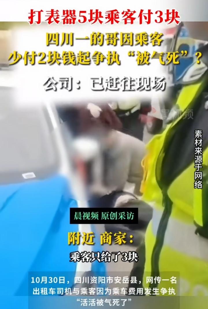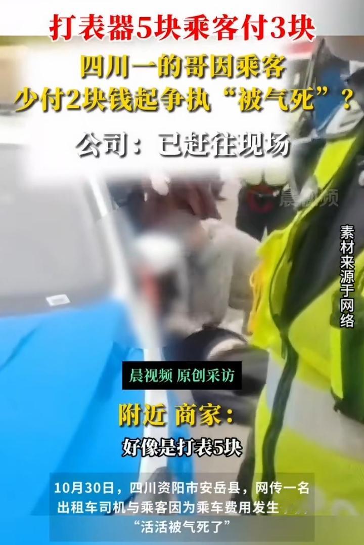 潇湘晨报消息:四川一出租车司机拉了一名乘客,打表显示五元而乘客只愿意支付3元,司机表示不能优惠无差价。 可乘客说什么都不愿意支付那两元,司机在和他争吵的过程中一口没缓过来,直接瘫倒在地上,乘客一看遭了立马做心肺复苏可为时已晚,出租车公司老板知道后立即前往现场,具体原因还要等通告,目前多部门已经介入,所知道的就是因为两元车费起争执,司机气的瘫倒在地。 只能说冤家路窄小气的乘客遇到身体有恙的司机,出门在外该怎样就怎样,有些消费是可以打价的,有些消费是不能打价的,坐出租车付五元已经便宜的无可挑剔,可还是要少付两元真的是滑天下之大稽,应该多理解别人的不易,而不是处处为难别人,小钱打不了折扣,大钱无需折扣,而人为的情绪在大小之间,或许清晰的思维才是应对任何问题的砝码,不要用别人的错误来惩罚自己,任何情况下都不要生气因为解决不了问题,而自己气到了别人也不会太在意,有时候人生需要睁一只眼闭一只眼,不能过于认真。