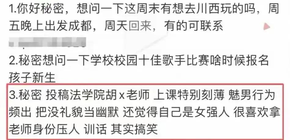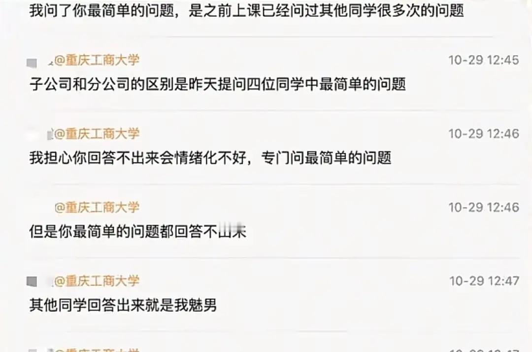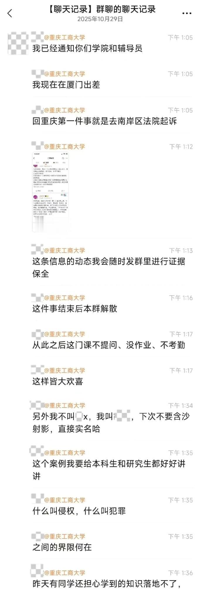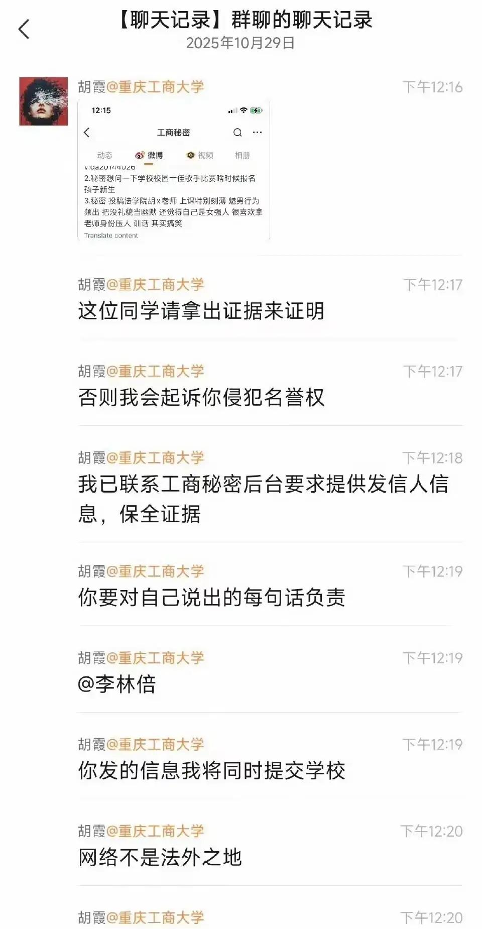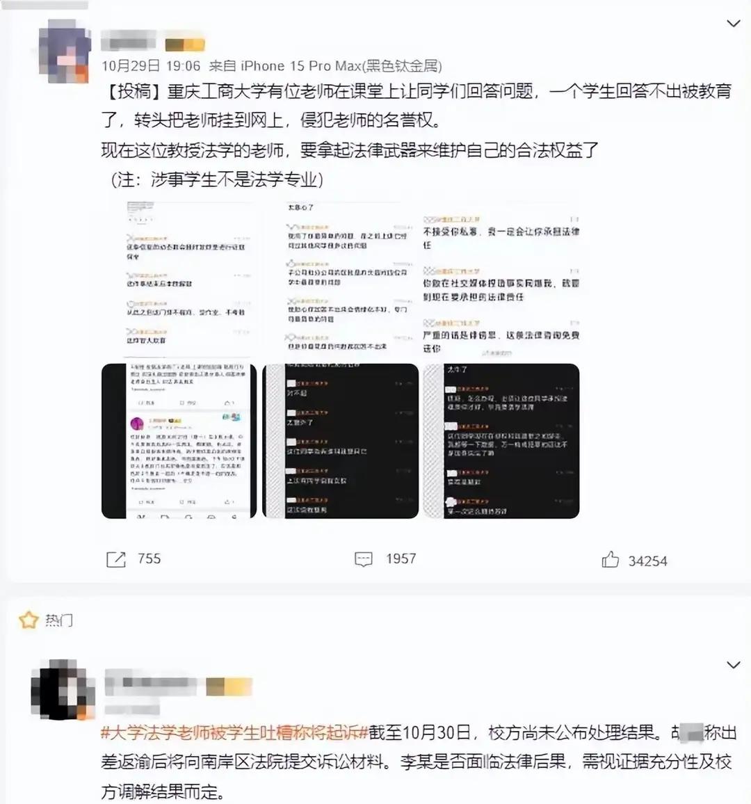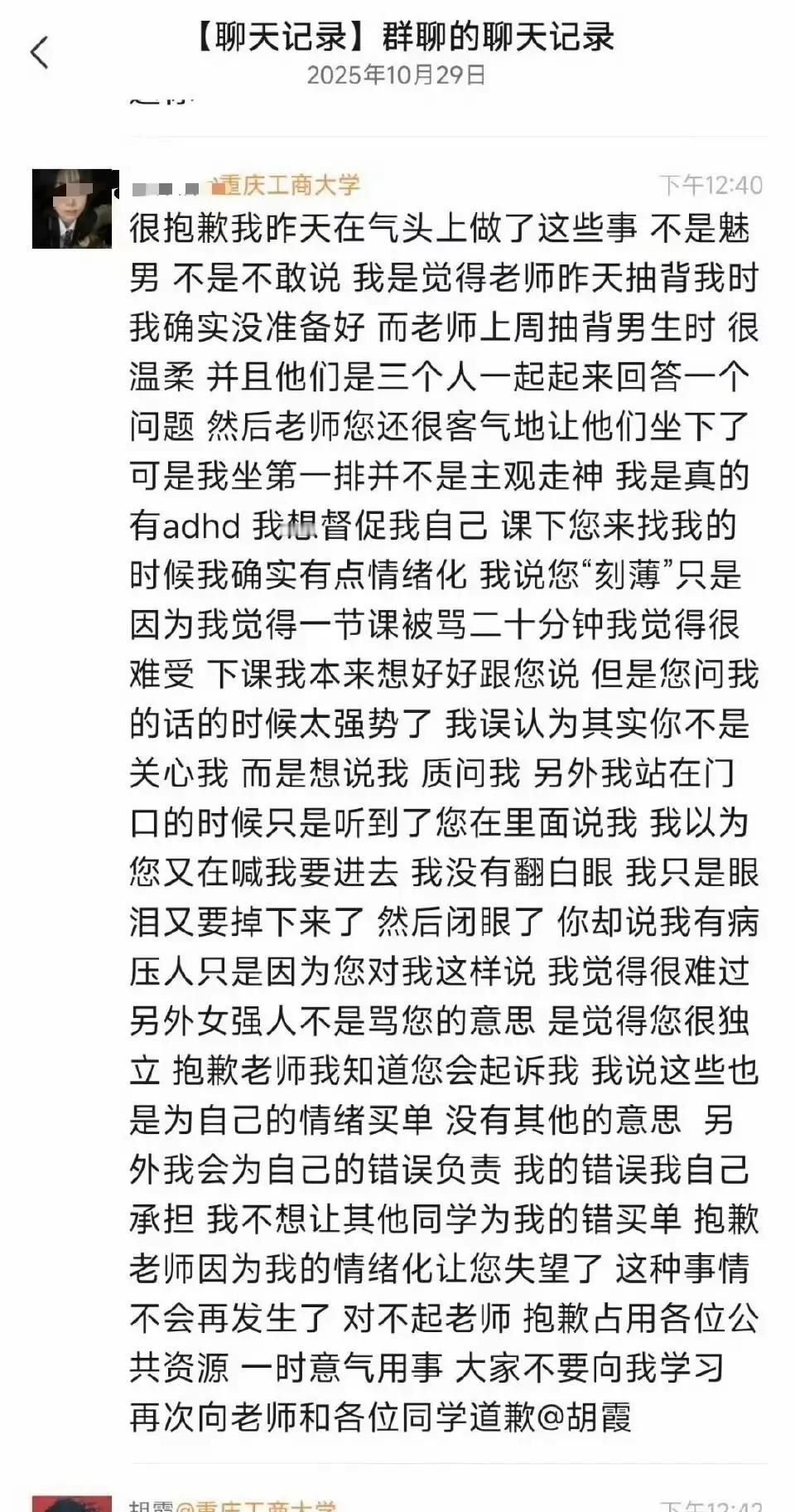 “匿名吐槽也翻车!”重庆工商大学一女生在校园匿名账号发帖,控诉法学院胡老师“刻薄、魅男、拿身份压人”,没想到遇上老师硬核追责,最终慌忙道歉仍难平息事态,网友:法学知识可不是白学的! 据大象新闻10月30日报道,10月29日该校“工商秘密”账号收到学生李某的匿名投稿,帖子无任何实锤证据,却在两小时内刷遍新生群和教职工群。 涉事的胡老师看到后,当即在教职工群硬核回应,要求对方拿出证据,否则就以侵犯名誉权起诉,同时联系平台调取IP和注册信息。 这波操作让李某压力倍增,主动现身道歉,称自己患有ADHD,课堂抽背未准备好被批评后情绪失控,误判了老师行为。 但胡老师明确表示不接受道歉,坚持要追究法律责任,还称要把这事当成教学案例,让学生明白言论需负责。 目前学校已介入处理,但相关情况暂未详细披露,而胡老师表示出差回渝后将正式起诉。 对于这件事情,大家有什么看法? 今天的分享到这里就结束了,大家对此事有何看法,欢迎在评论区留言和讨论,感兴趣的可以点击头像加关注,我将每日更新优质内容,我们下期见。