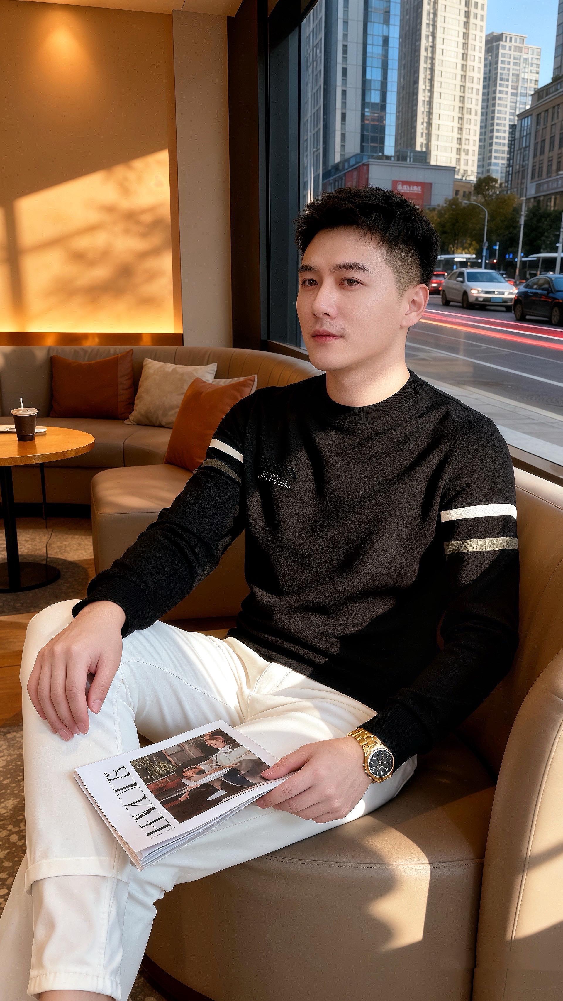 他穿的黑色拼接夹克很衬气质,皮质面料泛着柔润的光,和哑光布料衔接得恰好...