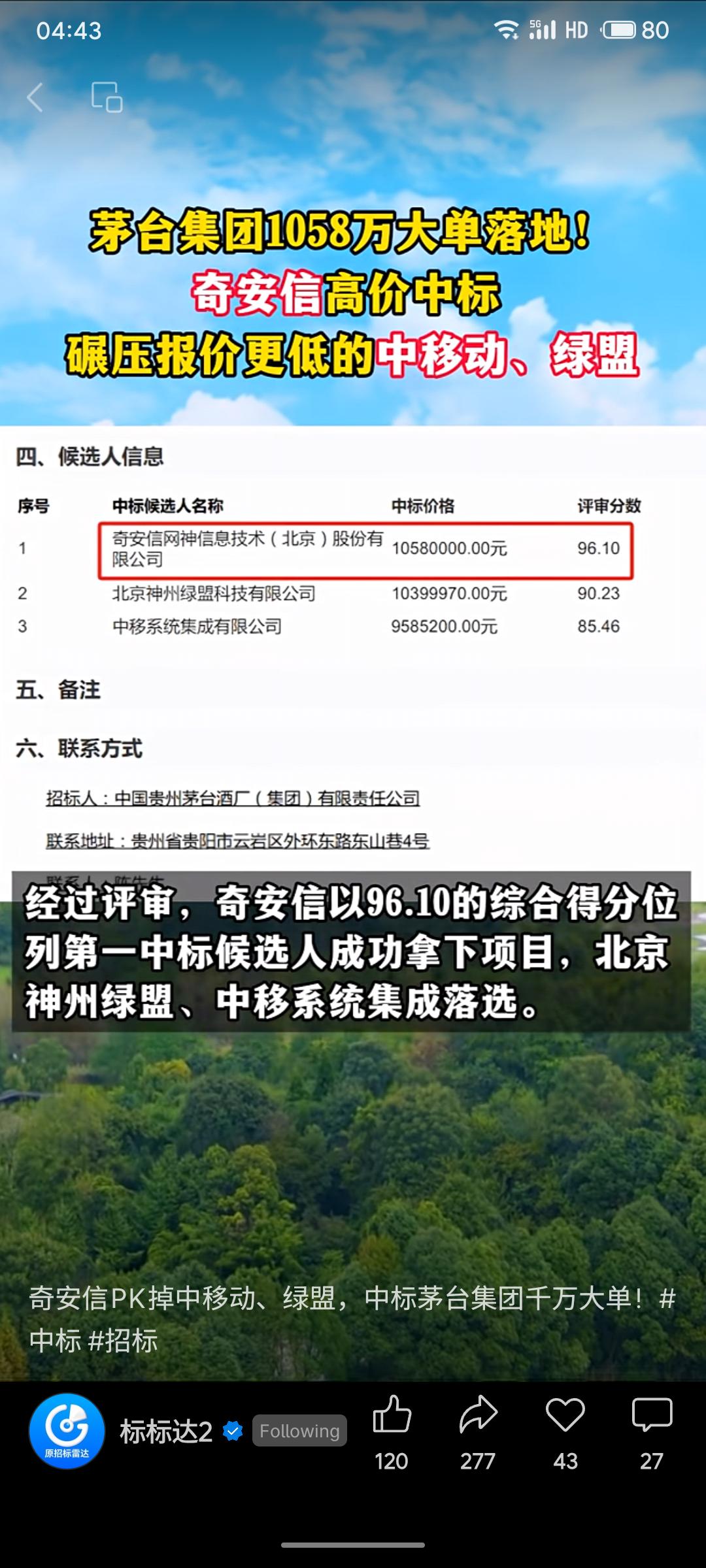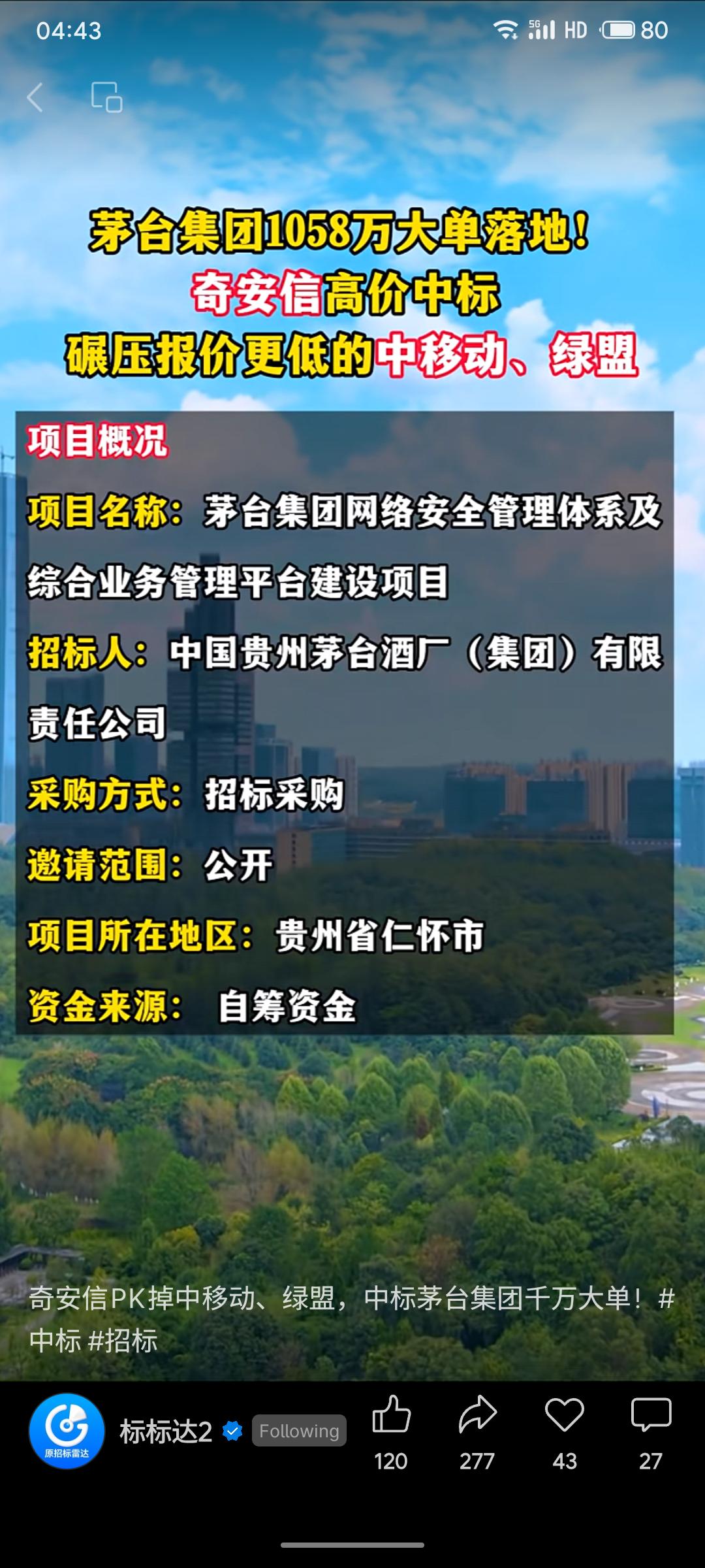 茅台集团网络安全项目近日完成招标,奇安信以1058万元中标,其报价虽高于竞争对手