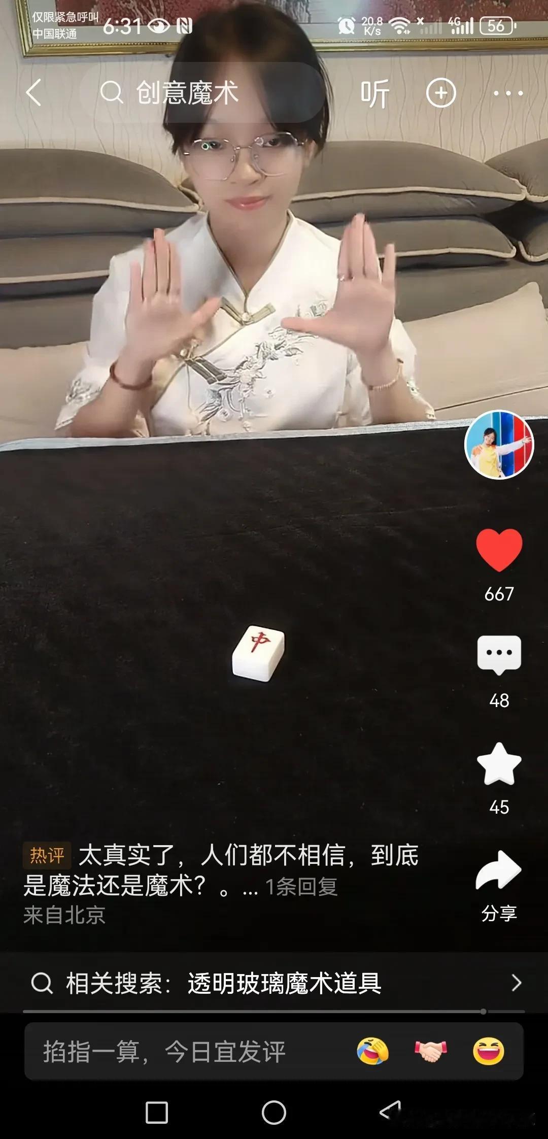 天呐,魔术都已经进化到这种程度了吗? 只见这位气质高雅长相清秀的年轻女魔术师将三块麻将牌“发”逐渐移动,逐渐合并为2块,1块,最后在她手里变成“中”,中间没有任何遮挡,没有任何多余的假动作,一切都在你眼皮底下发生,根本无法解释啊! 她的其它魔术更加令人惊奇,比如硬币穿杯,观众可以直接看到穿越杯壁的过程,听到声音,可就是看不懂,太神奇了! 果然高手在民间啊!
