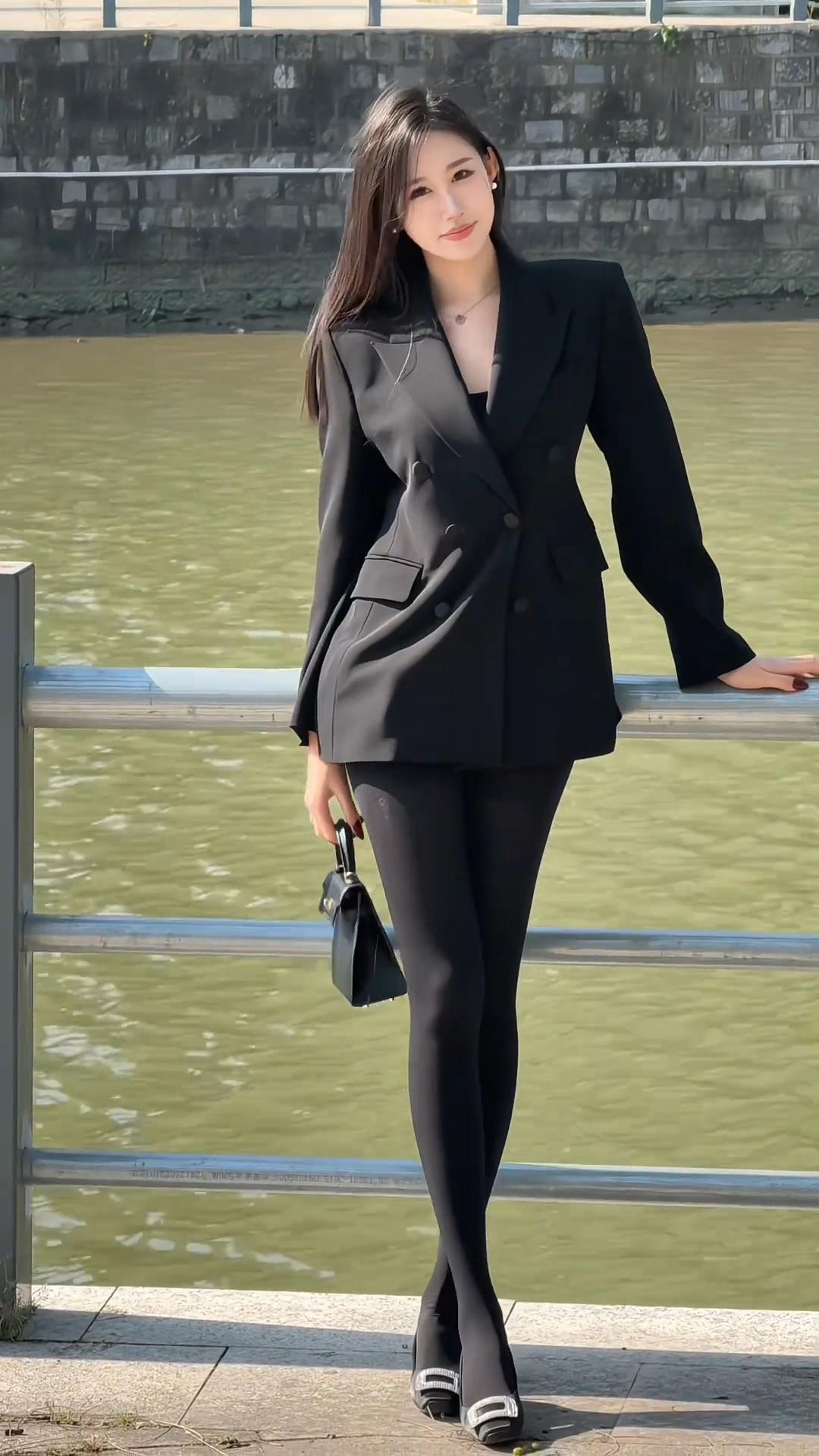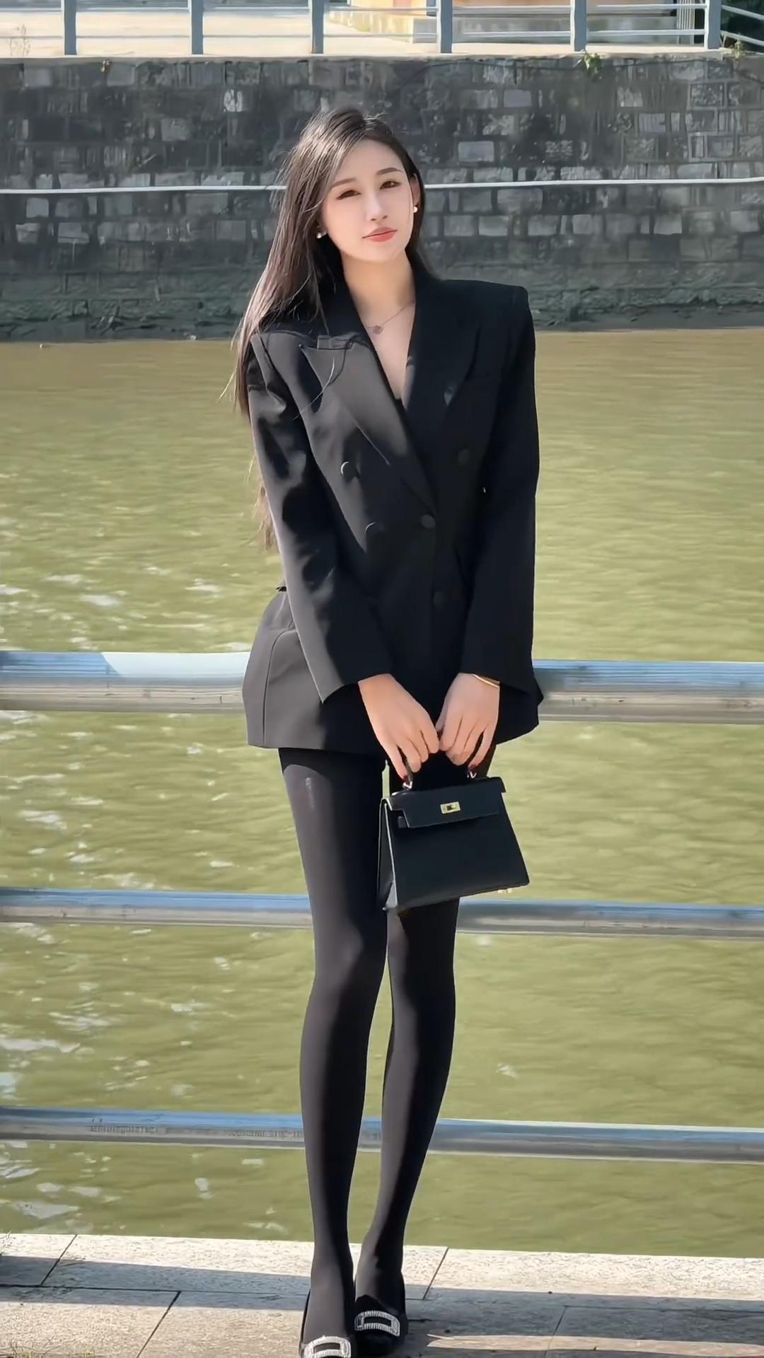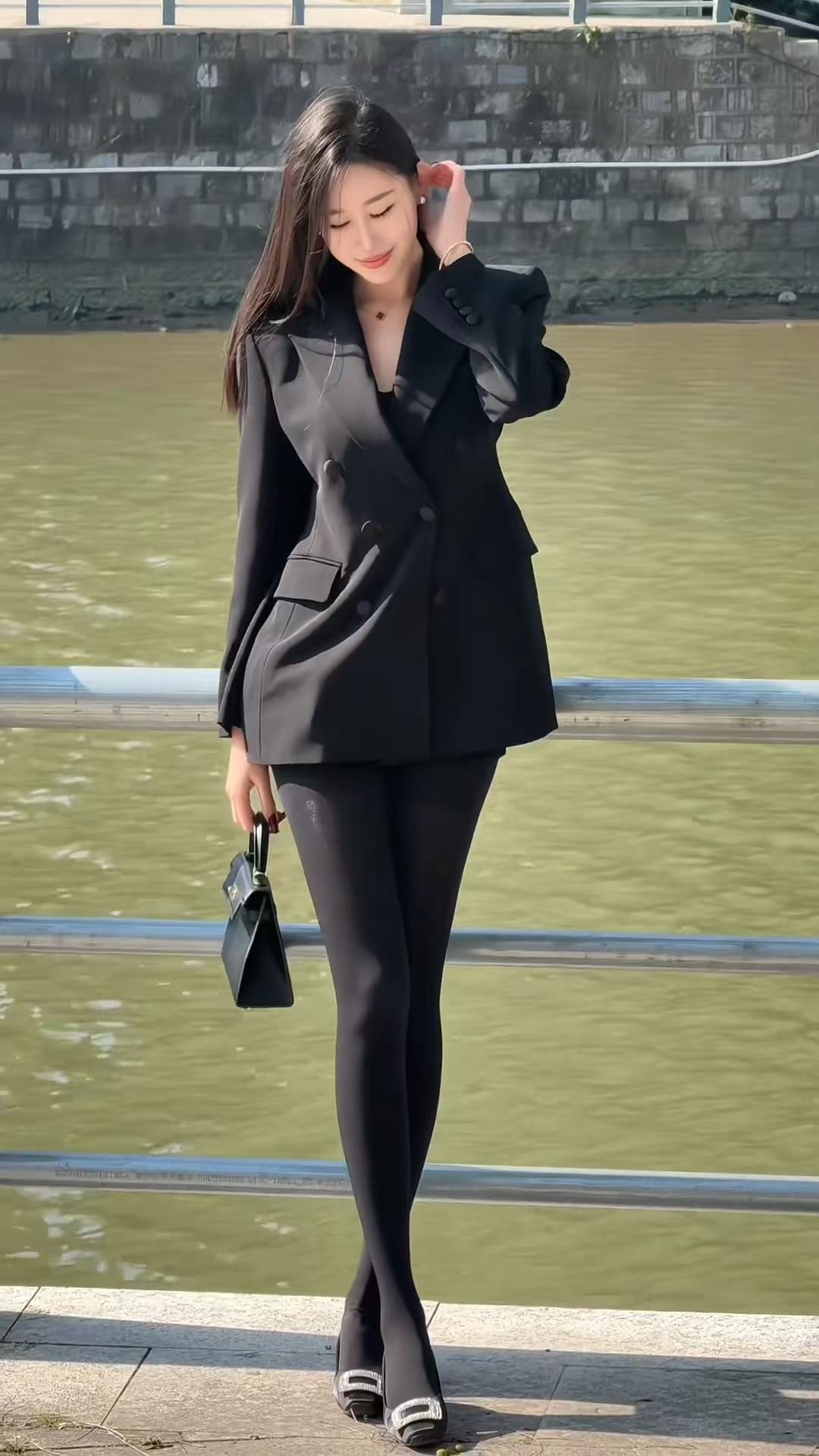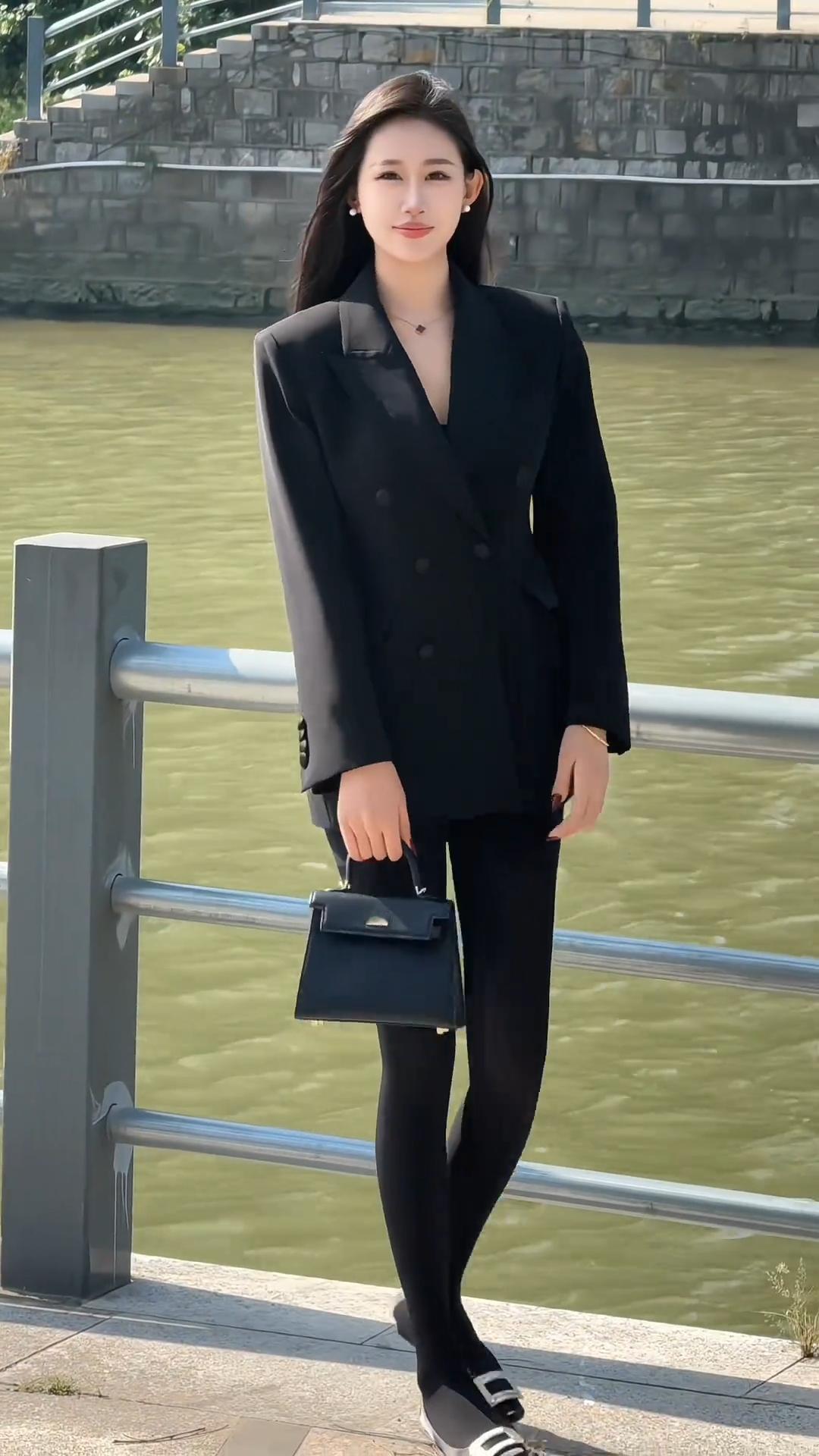 秋日的海边, 天空澄澈, 白云悠悠。 我穿着黑色丝袜与平底鞋, 在岸边拍照留念。