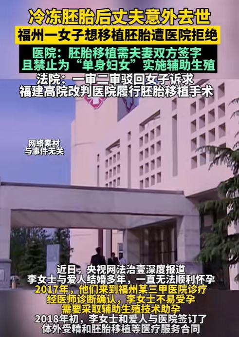 福建福州,女子婚后几年没有孩子,于是通过胚胎移植技术生下了一个儿子,可在她和丈夫预备要二胎期间,丈夫突然离世。女子决定按照她和丈夫的打算继续要孩子,可医院却说,不能让孩子一出生就没爸爸,不同意给她移植。女子不服起诉,一审二审都判医院赢,可再审却有不同意见。 “如果胚胎能说话,它会不会问:‘我的爸爸去哪儿了?’”这个看似天真的问题,背后却是李女士在丈夫突然去世后,想要使用两人早已冷冻的胚胎生育二胎,却遭到医院拒绝。医院说:“不能让孩子一出生就没爸爸。”这句话本是好意,却让李女士陷入了漫长的诉讼之路。 时间回到2018年,李女士和丈夫因多年不孕,选择了试管,用了2年多的时间,才生下了大儿子,剩下的2个胚胎就被冷冻起来。那时的他们满怀憧憬,约定将来用那2个胚胎生育二胎。 然而,2020年9月,李女士的丈夫突然因病去世。悲痛之余,李女士她决定继续移植计划,却没想到,医院竟然坚决拒绝。 “根据规定,需要夫妻双方同时在场并签字确认。”医生无奈地解释。 “可是我的丈夫已经不在了啊!”李女士无法理解。 医院的担忧并非毫无缘由,我国规定,禁止给单身妇女实施人类辅助生殖技术。在医院看来,丧偶的李女士现在正属于“单身妇女”范畴。 对此,有网友评论:“她一个人,又要工作又要照顾大儿子,已经够辛苦了。如果再添一个新生儿,怎么忙得过来?这可不是光有决心就够的,医院做得对。” 的确,现在的父母们很多都是从幼儿园就开始内卷,再加上辅导作业,有父母带一个孩子都已经觉得累了。更别提经济的重担、新生儿出生后的那些个不眠之夜、孩子们同时生病的慌乱,以及独自承担所有教育决策的孤独,这些都不是仅仅“有心理准备”就能扛下来的。 让李女士绝望的是,一审、二审法院都站在了医院一边。法院虽然同情李女士的遭遇,但“必须严格执行现行法律规定”。 “我就想要个我丈夫孩子,怎么就这么难?”转机出现在福建省高级人民法院的关注下,经过合议庭的研究,他们认为:李女士的情况不能简单地归类为“单身妇女”。她和丈夫当时是一起决定要生二胎,丈夫虽然去世了,这个事实却并没有改变。 而且,保存胚胎是双方共同意愿。丈夫生前的签字、续费行为,已经充分表达了他的生育意愿。李女士虽然已经丧偶,但并不能简单地等同于“单身妇女”。 那些被冷冻的胚胎,不只是冰冷的医学样本,它们承载着的是一对夫妻的共同承诺,一个家庭的未来期许,以及一个逝者留在世间的唯一印记。 所以,法院最终认可了她使用冷冻胚胎的权利。但遗憾的是,胚胎移植手术并没有成功。 不过,李女士说,这场仗她必须打:“至少我为他争取过了,这世上有人记得他留下的念想。” 如今,她把心思都放在陪伴大儿子成长上。孩子经常指着照片喊爸爸,她就会讲起从前的故事。生活总要继续,那些努力过、争取过的痕迹,都成了支撑着她继续往前走的力气。毕竟,他们一家三口曾经在一起过,也永远是一家三口。 信源: 光明网2025-10-30 ——女子想用亡夫胚胎做试管二胎,医院拒绝:不能让孩子出生就没父亲!法院终审改判 文│一阳 编辑│史叔