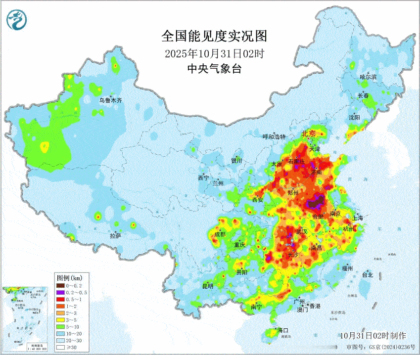 今晨部分站点能见度不足100米,比如甘肃宁县、陕西汉阴、山西万荣、平陆、安泽、屯留、壶关、潞城、河北唐山、广宗、威县、山东平阴、河南三门峡、登封、安徽太和、阜南、颍上、寿县、凤台、长丰、蚌埠、怀远、五河、灵璧、湖北竹山、宜城、长阳、监利、湖南华容、桃江。