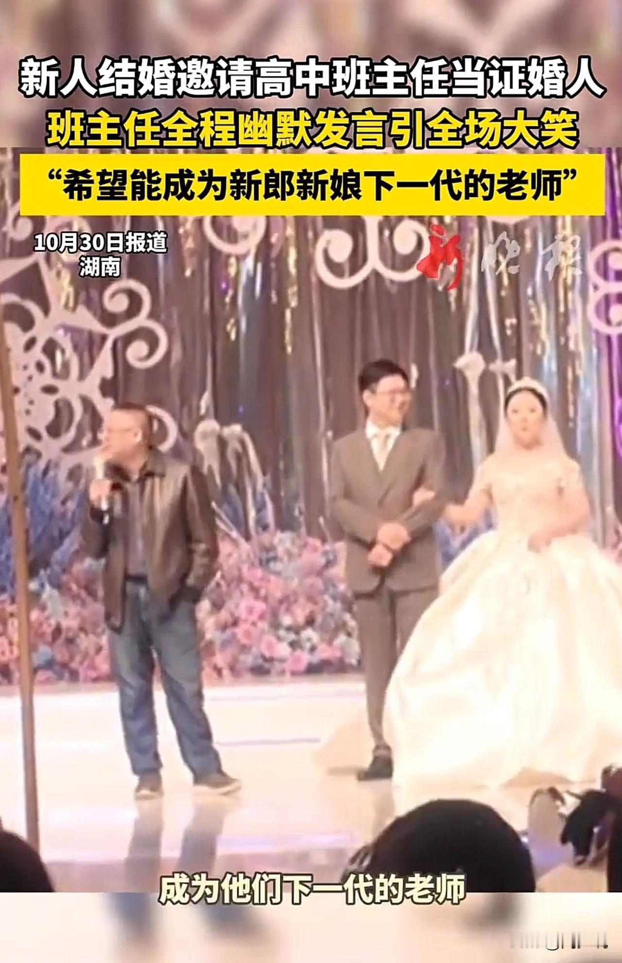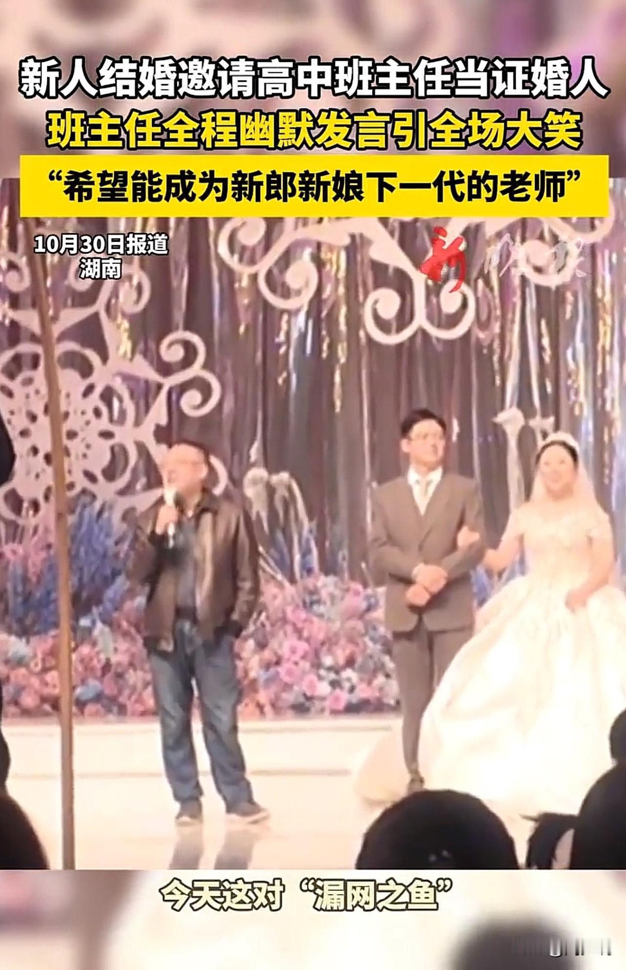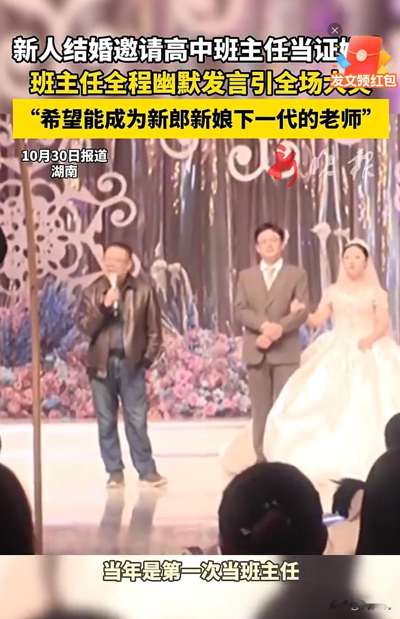 #新人结婚邀请高中班主任当证婚人#新人结婚请高中班主任证婚,没想到老师一开口就引爆全场,圈粉无数!网友:“这祝福太实在!” 婚礼现场,班主任拿起话筒笑着坦言:“我特别幸运,当年第一次当班主任,没什么经验,才造就了他们这对‘漏网之鱼’。”话音刚落,现场便响起阵阵欢笑。 随后他送上祝福,希望新人早生贵子,还打趣道:“我离退休还有18年,说不定能当他们下一代的老师。”话没说完,就被更热烈的笑声和掌声打断。 网友纷纷留言:“这班主任也太幽默了,气氛组担当实锤!”! 也有网友说,漏网之鱼这个形容太妙了,满是师生间的亲切感。”! 还有网友说,“这样的祝福又暖心又有趣,新人肯定一辈子记得。” 周少想说这场充满欢声笑语的证婚,跳出了传统祝福的套路,用幽默藏着老师的温情与欣慰。班主任的风趣不仅活跃了婚礼氛围,更让这份师生情谊和新婚喜悦格外动人。 总而言之,这种接地气又有温度的互动,正是最打动人的烟火气,也难怪能收获大家的喜爱。这样幽默又风趣的班主任,怎能让人不爱呢? 对于这位高中班主任爆火,大家怎么看呢?#寻美三湘# #长沙新朋友#