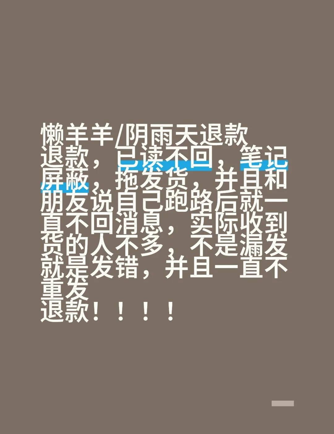 懒羊羊/阴雨天退款 退款,已读不回,笔记屏蔽,拖发货,并且和朋友说自己跑路后就一直不回消息,实际收到货的人不多,不是漏发就是发错,并且一直不重发 退款!!!!