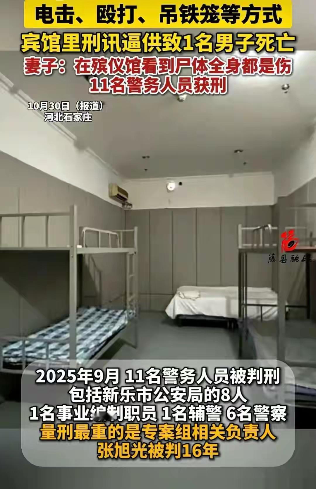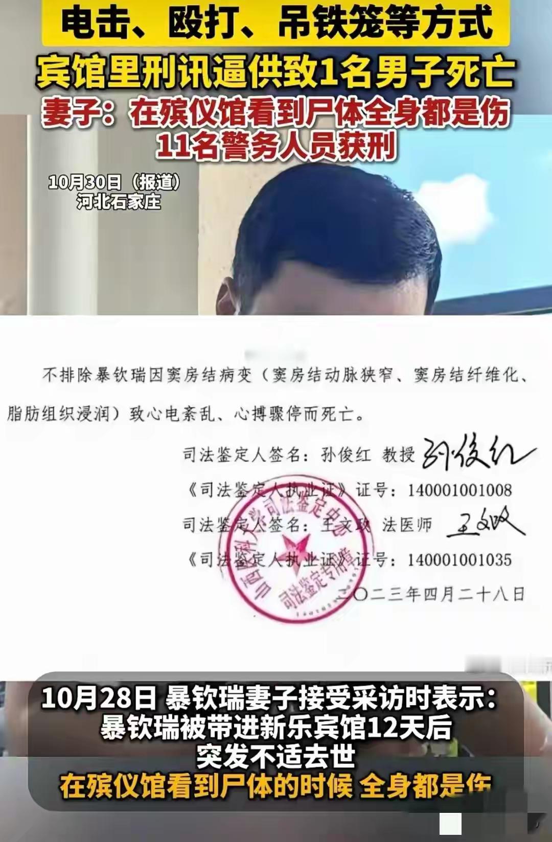 2022年7月,河北石家庄33岁的暴钦瑞因涉嫌寻衅滋事,被新乐市公安局在当地一家宾馆实施指定居所监视居住。谁也没想到,这个本应依法开展的执法环节,竟成了一场夺走他生命的噩梦。参与办案的11名警务人员将宾馆变成了审讯“刑房”,轮番对暴钦瑞实施刑讯逼供。他们动用多种残忍手段:用手摇电话机产生电流电击身体,让他在剧痛中抽搐;用PVC管、镐柄反复殴打,用烟头烫脚;将他长时间锁在铁椅上限制行动,甚至把人吊进专门焊制的窄小铁笼里折磨,还采用“开飞机”等侮辱性方式逼取口供 。更令人发指的是,同期被监视居住的10人中,包括暴钦瑞的父亲、叔叔在内的9人都遭到了类似对待,他的叔叔更是被踢断肋骨,构成轻伤。被带走12天后,暴钦瑞的身体彻底垮了。2022年7月19日晚,他突发严重不适,虽经紧急抢救仍不幸离世。起初的诊断未能明确死因,直到最高人民检察院司法鉴定中心介入,真相才得以揭开:暴钦瑞的死是长时间限制性体位、反复殴打和电击损伤导致的,这些伤害引发下肢深静脉血栓脱落,最终造成肺动脉血栓栓塞,导致急性呼吸循环功能衰竭死亡 。案发后,涉案警务人员非但没有主动担责,反而试图掩盖罪行。主犯张旭光连夜拆走监控硬盘、藏匿铁笼铁椅,还有办案人员组织建立攻守同盟,甚至模拟审讯对抗调查。好在正义从未缺席,在媒体曝光和最高检督办下,案件由保定市检察机关异地管辖,11名涉案人员悉数落网 。2025年9月底,保定两地法院作出一审判决。根据《中华人民共和国刑法》相关规定,司法工作人员刑讯逼供致人死亡的,依照故意杀人罪定罪从重处罚。最终,11名涉案警务人员全部获刑,其中新乐市公安局民警张旭光因故意伤害罪、刑讯逼供罪被判16年,其余10人分获1年9个月至6年不等刑期。目前,10名获刑人员已提出上诉,案件尚未有最终定论。 评论; 判的太轻重了,执法犯法,和谋犯法,共同犯法,对9人刑讯逼供,致一人死亡,手段残忍,令人发指,不严惩,难平民愤。难改变对政府形象的损害,不能让这些老鼠坏了广大群众对政府的信任。 这就是近代中国的公安警务人员,不是个案,国家应对全国政法系统来一个整体严查,严惩,整改,教育。让整个政法系统能真正成为人民群众信任的警察叔叔! 惨无人道,知法犯法,11名警察必须死刑,并进行国家赔偿。在全国公检法司系统开展以案为鉴、以案促改警示教育。 我呼吁主犯判处死刑,国家三令五申不准严刑逼供,知法犯法应该判死刑,同意的请举手! 还有一个重点是,起初的诊断未能杳明原因,直到最高检介入才查清死亡原因,是基层的设施不行还是人的原因?是设备情有可原,如是人的原因应该追责。 电击生殖器,这得有多变态呀?中统、军统、七十六号都不一定做的不出来