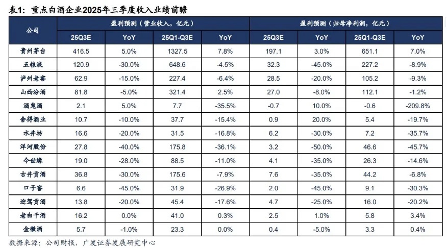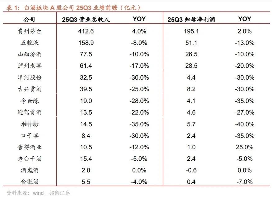 2025年三季报即将披露完毕,和某些行业公司出现大幅度增长相比,白酒行业整体业绩只能用惨淡来形容。在已经公布业绩的白酒上市公司中多数都是第三季度业绩加速下滑,部分公司净利润同比降幅近三位数。口子窖第三季度主营收入同比下降46.2%,净利润更是同比下降92.6%;老白干酒第三季度营收下降47.6%净利润下降68.5%;今世缘第三季度营收19.3亿元下滑26.8%,净利润下降48.7%;迎驾贡酒第三季度营收13.6亿元同比下降20.8%,净利润3.8亿元同比下滑39%;金徽酒第三季度营收5.5亿元下滑4.9%,净利润0.3亿元下降33%;山西汾酒第三季度营收89.6亿元同比增长4.1%,净利润39.7亿元同比下降1.4%;泸州老窖第三季度营收66.7亿元同比下降9.8%,净利润31亿元同比下降13.1%;古井贡酒第三季度营收25.5亿元同比下滑51.7%,净利润3亿元同比下降74.6%。