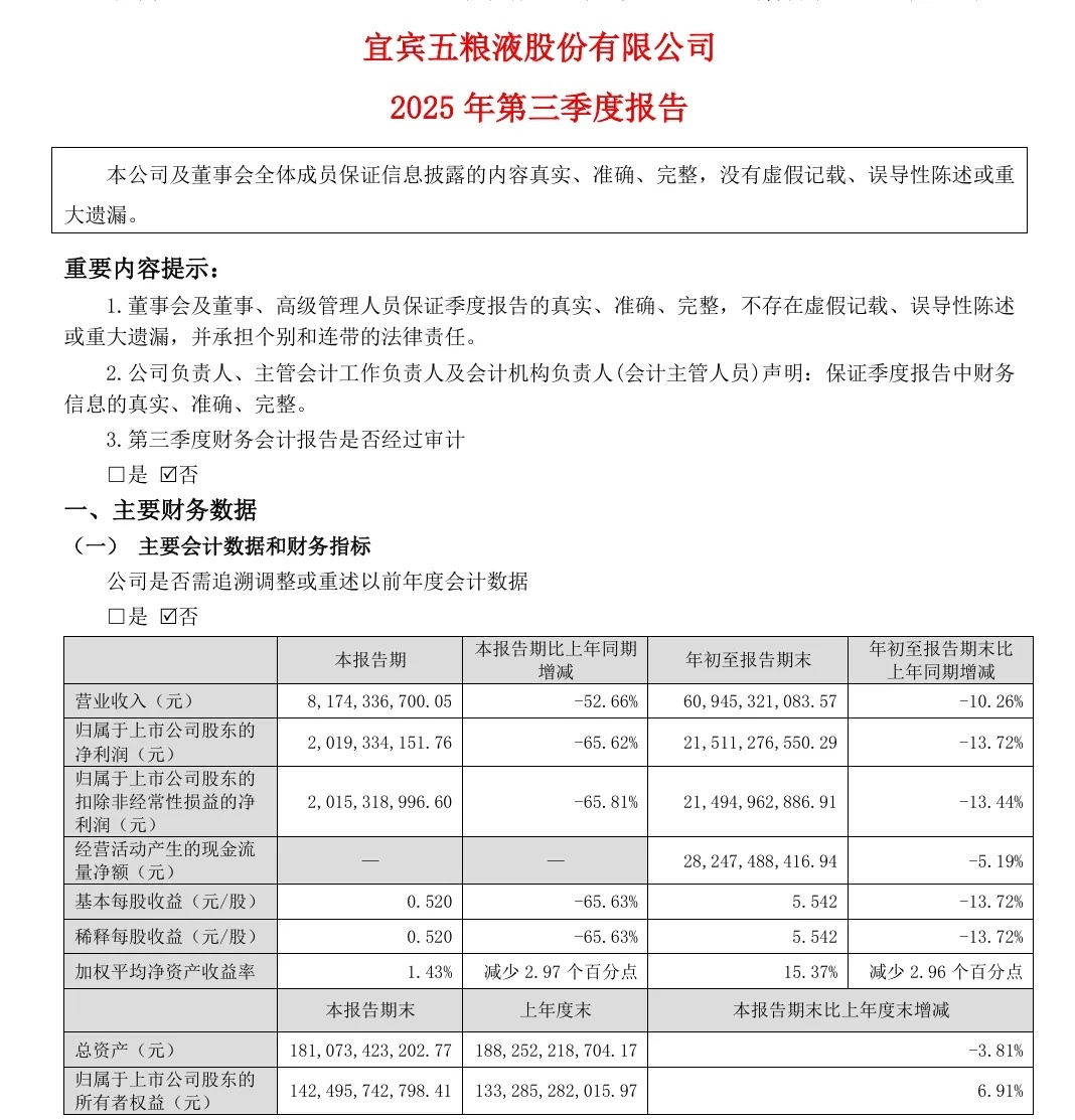 10月30日茅台披露了三季报,更是让不少人震惊。过去的一两年白酒行业明显都在下滑,但是茅台依旧保持着不错的增长势头。2022年到2024年茅台的营收和净利润基本上都还能保持15%到20%之间的增长,但是进入2025年之后营收和利润的增长速度明显放缓。今年第三季度贵州茅台实现营收390.64亿元,同比仅增长0.56%;实现归母净利润192.24亿元,同比仅增长0.48%。10月31日五粮液也披露了三季报,第三季度营收为81.74亿元,同比下降52.66%;净利润为20.19亿元,同比下降65.62%。前三季度营收为609.45亿元,同比下降10.26%;净利润为215.11亿元,同比下降13.72%。
