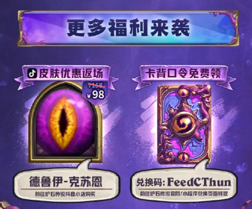 炉石传说 克苏恩之眼卡背记得领!去炉石官方小程序里输入兑换码“FeedCThun”可免费领,这是之前的大预购的卡背,后面也500金币返场过,有过的就比较血亏!