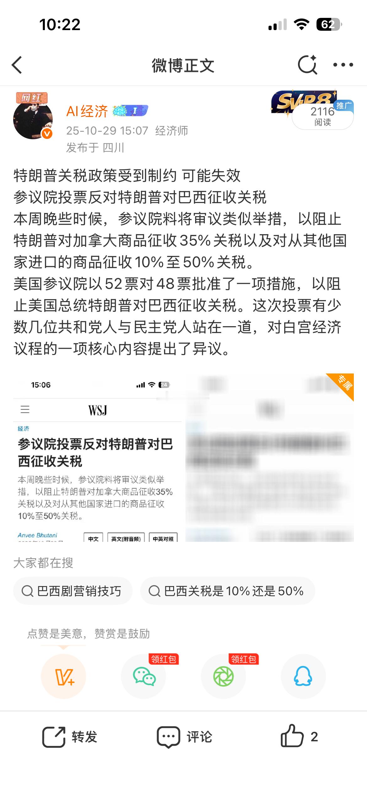 特朗普全面关税被参议院批准终止 这是我们前天发的旧闻 也是特朗普急于谈判让步的可能原因之一 提前获得资讯 提前做出预判