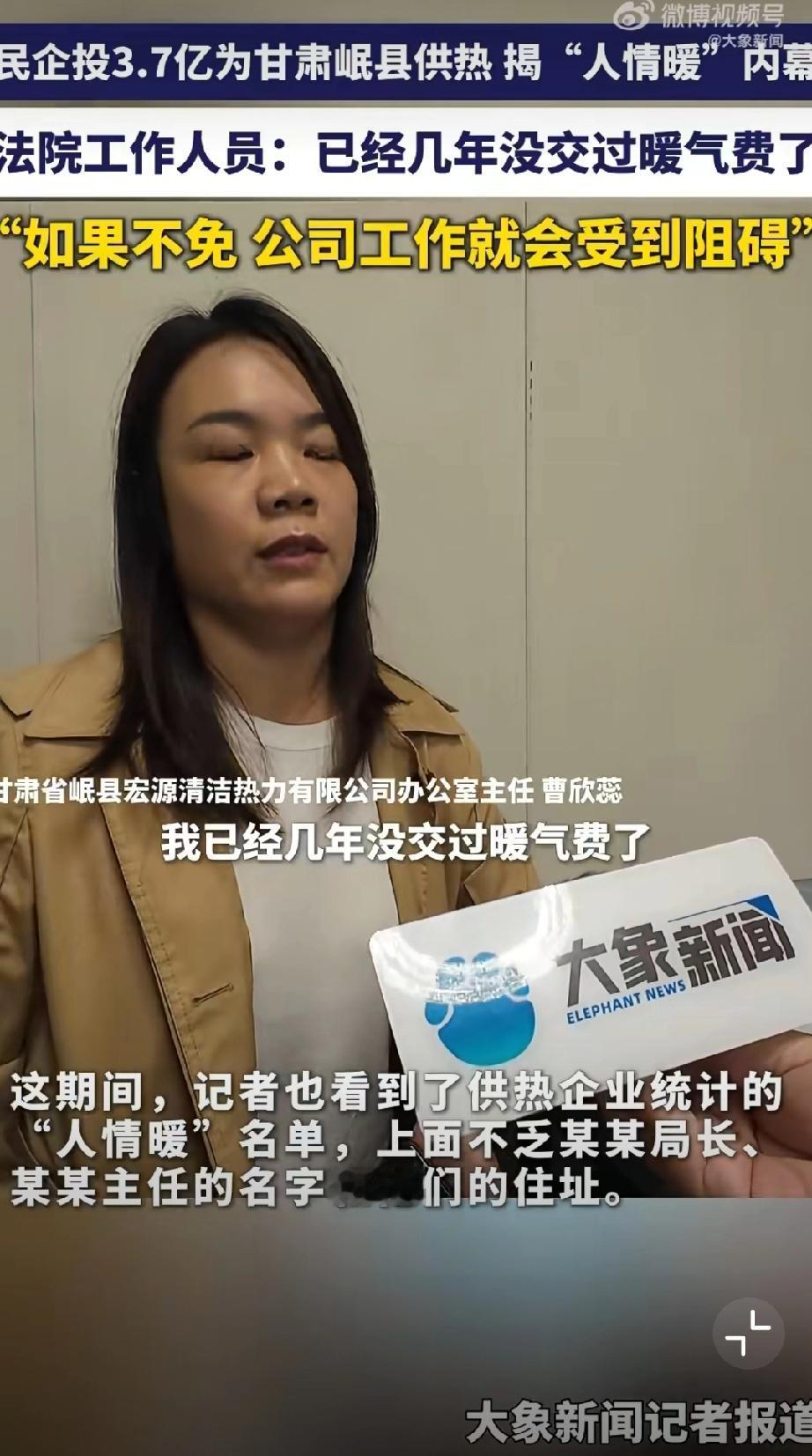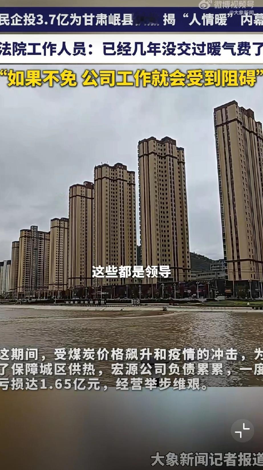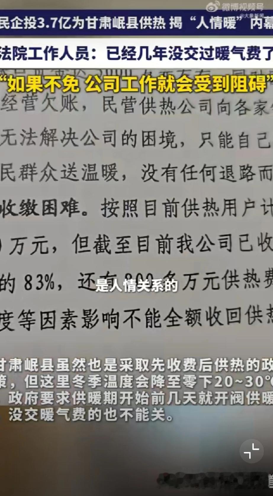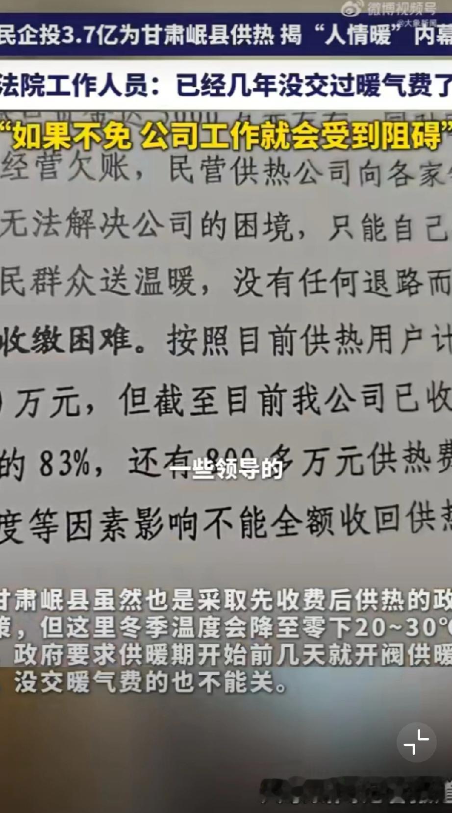 甘肃岷县一民营供暖企业,被领导打招呼有1000多户不收暖气费。如今因企业被当地强行接管,把这个事暴露出来了。 如果名单暴露出来?完全不敢想象 其它行业是否存在类似现象呢?供暖收费 供暖乱象 供暖收费乱象