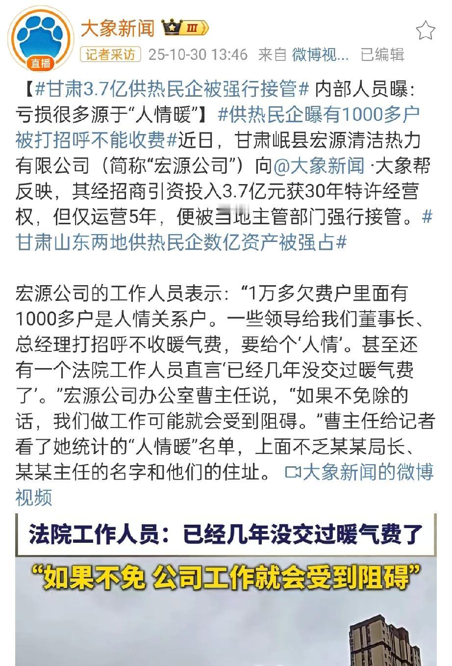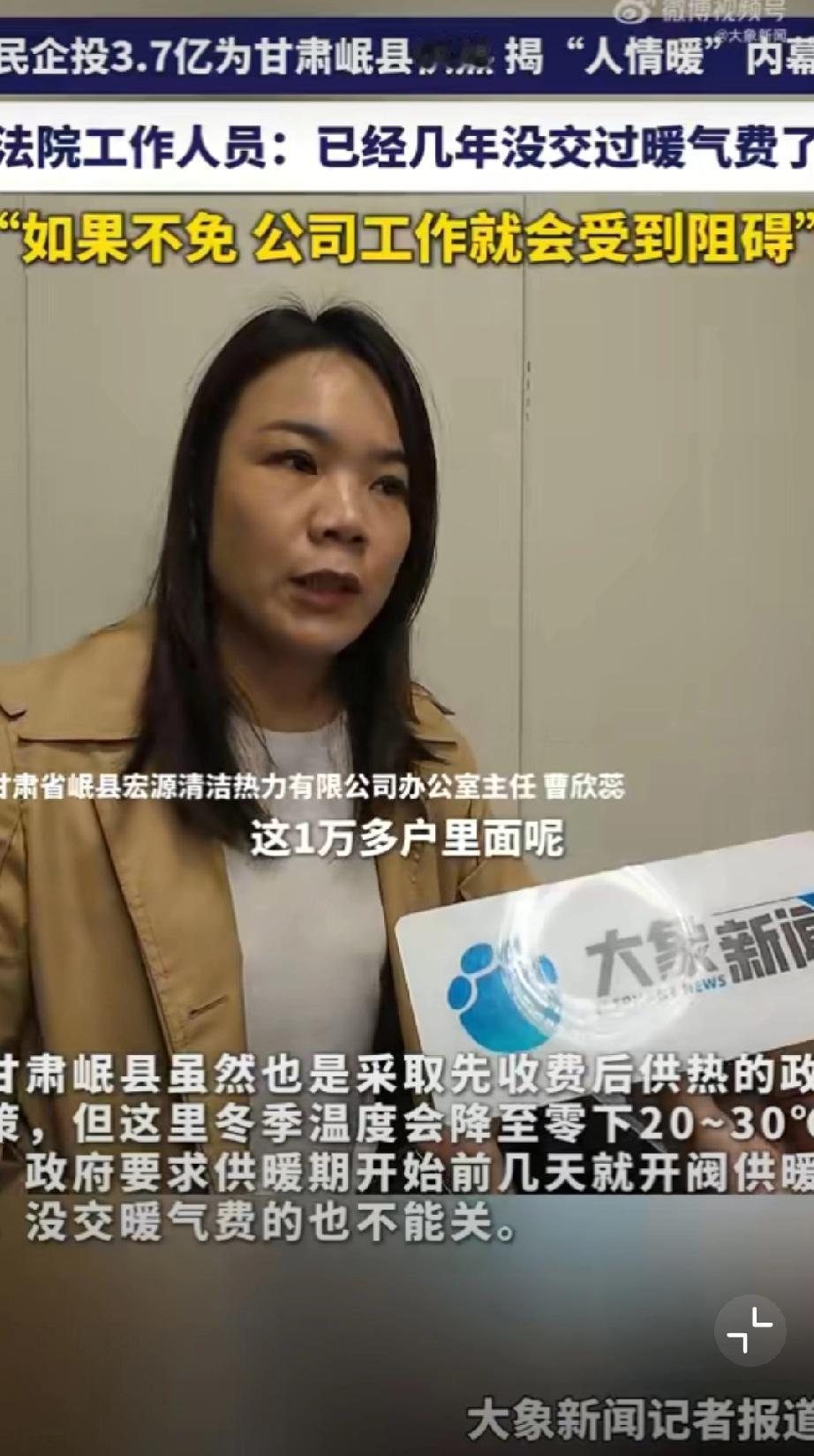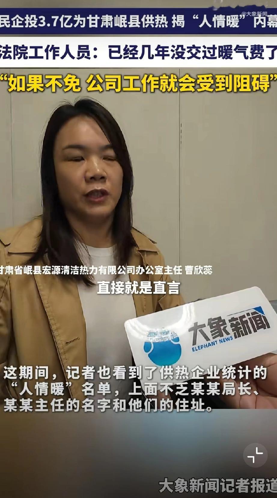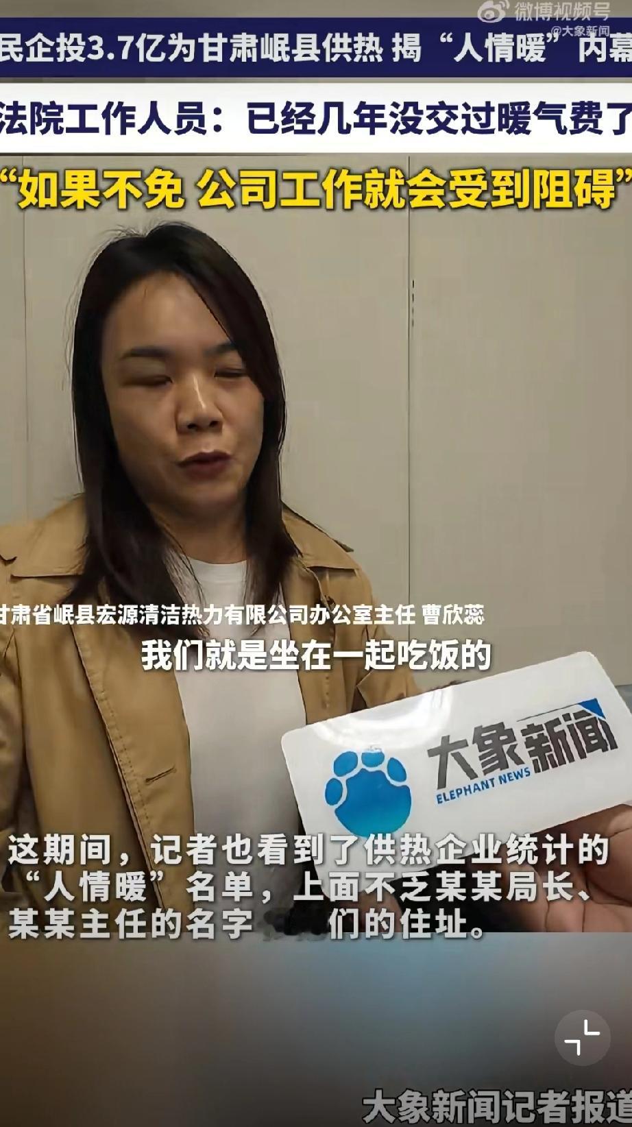 甘肃岷县一民营供暖企业,被领导打招呼有1000多户不收暖气费。如今因企业被当地强行接管,把这个事暴露出来了。 如果名单暴露出来?完全不敢想象 其它行业是否存在类似现象呢?供暖收费 供暖乱象 供暖收费乱象