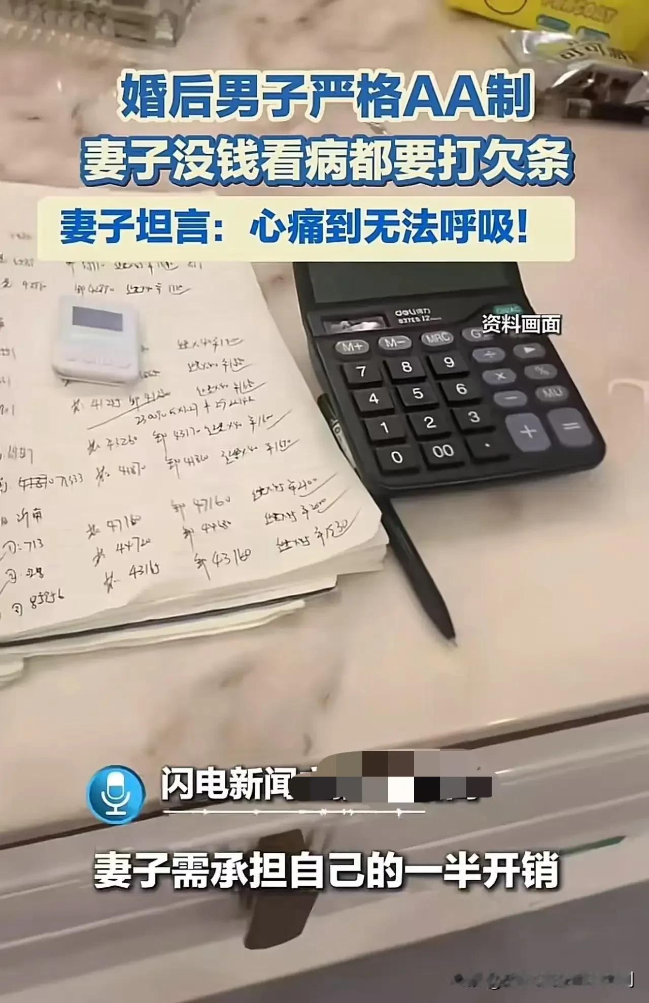 广东,男子婚后担心妻子胡乱花钱,所以和妻子约定好,家里的一切开销都要“AA制”,就连计生用品也要平摊。可让妻子无法接受的是,自己生病了没钱治疗,男子却让她打欠条!妻子坦言:我的心好痛。(来源:闪电新闻) 事情的大致是这样的。女子经朋友的介绍,认识了现任的丈夫,丈夫这个人踏实能干也没有什么不良嗜好,不过却有一个很奇葩的习惯。 婚后所有的花销必须要aa制。 刚开始的时候,女子并没有感觉到什么不妥,毕竟这样的消费观念,在国外是非常流行的。 另外,女子也猜测,可能是由于刚结婚不久的缘故,丈夫的内心缺乏安全感,等两个人相处的时间长了,相信丈夫就能放下内心的戒备。 谁知,日子一天一天的过去,丈夫始终坚持执行aa制。 上到燃气费物业费、生活的开销,下到柴米油盐酱醋茶,甚至是一个小小的避 y套,丈夫都坚持平摊。 女子有些受不了,这样的相处模式,让他感觉不到一家人温暖的感觉。 在此期间,女子曾尝试与丈夫沟通,可丈夫却每次都是冷脸相对。被女子逼急了,丈夫就会发火。 女子也曾考虑过与丈夫离婚,可是看到自己那年幼的孩子,担心孩子从此以后缺乏父母的爱,女子还是于心不忍。 就这样女子一直跟着丈夫凑合着过,直到后面发生的一件事情,女子崩溃了。 女子感觉身体有些不舒服,到医院检查后,医生建议她要住院治疗。 可自从有了孩子之后,女子的工作便受到了很大的影响,收入也大不如从前,根本就无力承担治疗费用。 出现这样的情况,女子天真的以为,丈夫一定不会坐视不管。 谁知,丈夫在这个时候依旧坚持要aa制。女子坦言自己没有钱。 丈夫想了想,做出了一个让女子无比心痛的决定。 “我可以先给你垫付上,不过你要打欠条。” 也就是在这一刻,女子终于体会到了丈夫的冷漠与无情! Aa制听起来公平公正,可是等两个人结婚之后,夫妻之间本就应该互相扶持,互相帮助。如果在这个时候还指望不上另一半,那还不如自己单过。 那么从法律的角度,该如何看待这件事呢? 《民法典》第一千零五十九条规定,夫妻有相互扶养的义务,需要扶养的一方,在另一方不履行扶养义务时,有要求其给付扶养费的权利 。 依据上述法律条款可知,当夫妻一方患病时,另一方有责任提供生活上的照料以及经济上的支持。 确保患病的一方能够得到必要的治疗和生活保障。 每一对夫妻都有着不同的生活习惯与方式,对于男子在生活当中坚持aa制的生活习惯,我们并不能去评判对与错。 不过有一点可以肯定,当自己的结发妻子生病急需治疗费用的时候,作为丈夫,就应该在第一时间及时且必须的为妻子提供经济上的支持与生活上的关心。 可是在本案当中,男子在这个时候却提出让妻子打欠条,这样的行为,怪不得妻子会坦言心很痛。 对此你怎么认为呢?关注@胡究法的如法炮制 多学法律少吃亏 。