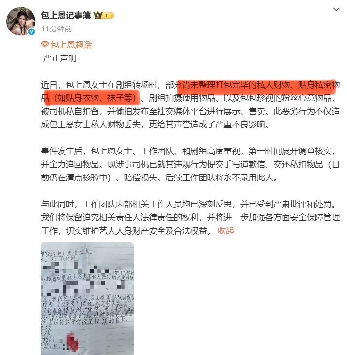包上恩方发声明”包上恩的贴身私密物品(如贴身衣物、袜子等)被司机私扣售卖“!太可怕了……[哆啦A夢害怕][哆啦A夢害怕][哆啦A夢害怕]包上恩私人物品被司机扣留售卖