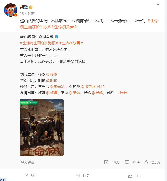胡歌 “巡山队” 的本质蕴含着团队的相处逻辑,成为讨论话题,同时杨紫与胡歌为《生命树》杀青写下文字,纪念拍摄结束。胡歌巡山队的本质杨紫胡歌杀青文生命树杀青