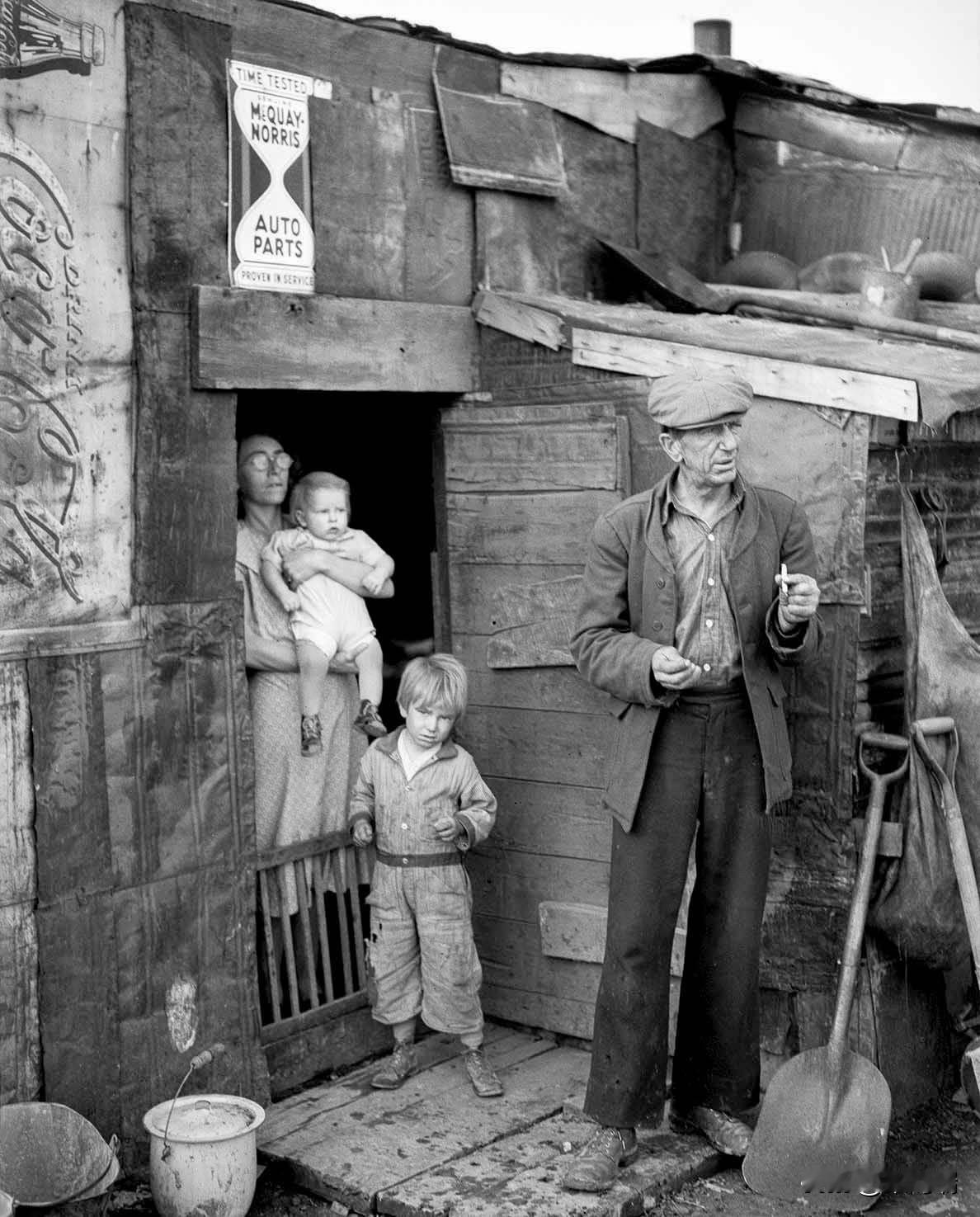 1939 年,美国伊利诺伊州威廉森县赫林市,一个靠救济金生活的家庭住在城市垃圾场的棚屋里。照片由亚瑟·罗斯坦拍摄。