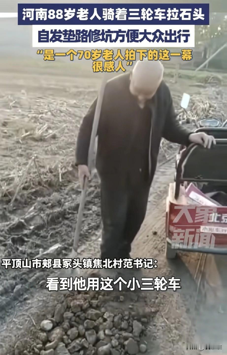 “愚公移山!”河南平顶山,88岁老人骑着电动三轮车为村里修路,这是条十几年的老路了,坑坑洼洼,来往车辆苦不堪言,老人每天骑着电动三轮车拉点石子把路上有坑的地方垫一下,路过的七十岁的大爷把这件事拍下来传到了网上。网友纷纷为老人点赞,最后祝老爷子长命百岁,这种善举不仅是为自己积福也为后代积福!