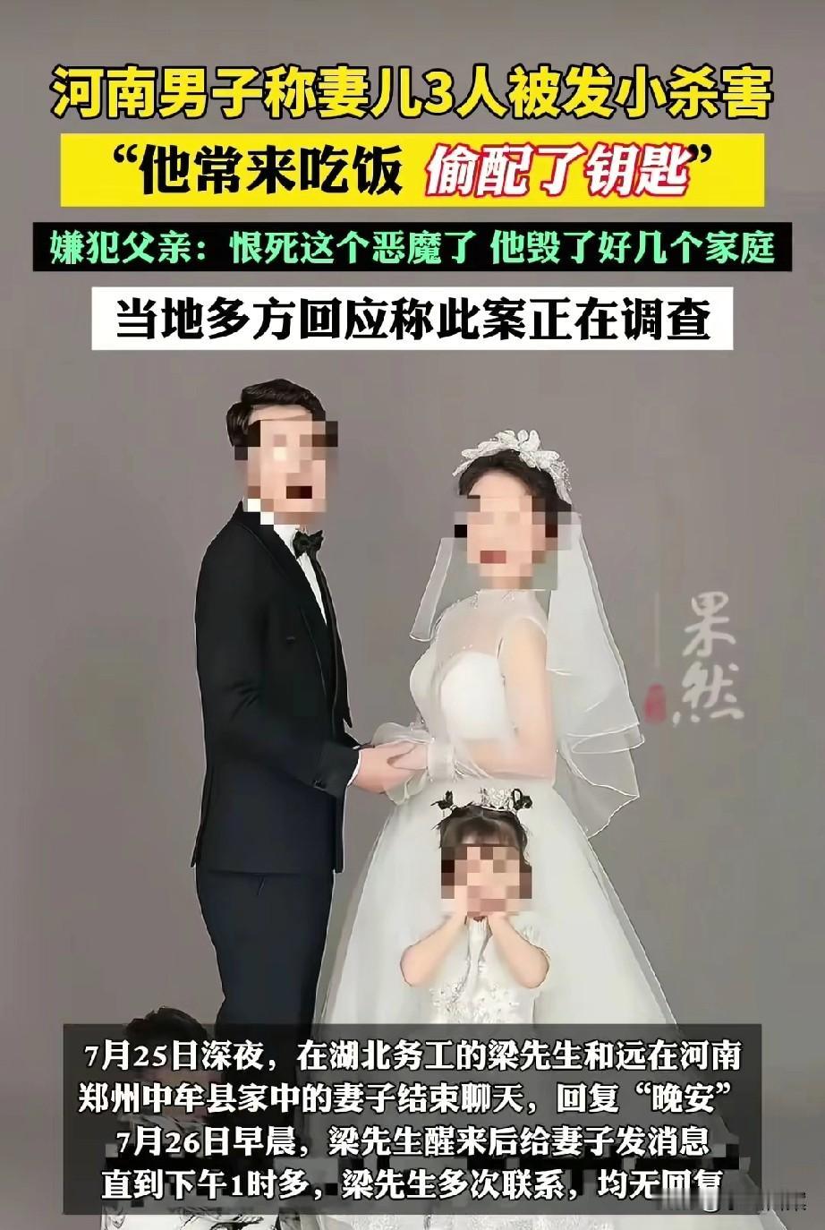 “媳妇儿,明年去旅游吧,坐飞机去,就咱俩,都干9年了!”这是河南妻儿3人遇害案前一天,远在外地务工的丈夫,给妻子发去的温情旅游计划。没想到就在第二天凌晨,30岁妻子连同2个七八岁儿女,被从小玩到大的发小给残忍杀害。 人间最好的爱情是从相识、相知、相伴、相爱,到步入婚姻、相濡以沫、相伴到老。若没有这一变故,梁先生和妻子的确有可能做到让爱情圆满。 结婚9年,他在外面赚钱养家,妻子在家照顾俩娃,虽山川阻隔,二人还是像恋爱期的小情侣一样,每天必须聊聊天、报报平安,以慰相思之苦。 计划旅游是7月25日,从对话看,两人共同为小家付出了9年,都没有机会好好享受二人世界,因此他们决定就两个人单独乘飞机去旅游,浪漫放松一把,恰如初婚的感情的确令人艳羡。 7月26日凌晨,梁先生的发小崔某用早已偷配好的钥匙悄悄潜入,妻子儿女3人被杀害,就此阴阳两隔! 说起崔某,梁先生一家不仅和他没有过节,反而各种对他施恩。从小玩到大的感情就不用说,此前崔某困难时,梁先生帮助工作、提供住宿,连晚上吃饭都是喊他来家里一起吃,丝毫没有把他当外人。 然而崔某丧心病狂,不知是出于嫉妒,还是为了求财,作案后毁损尸体、清理现场,将空调温度调低掩盖气味,显然是想逃脱法律的制裁。 白天在面对联系不上妻子的杨先生嘱托他去看看时,他还不慌不忙,假意称自己有事,真不知道心是如何长的! 可警察慧眼如炬,很快将崔某锁定为嫌犯,只是他的作案动机到底是什么?才是最让杨先生和一众网友费解的。 妻子貌美贤惠、儿女聪颖可爱,没想到一夜之间毁在了“自己人”手里,相约两人独自去旅游的计划,永远也只能停留在字里行间,每看一次便多痛一分。 崔某的罪恶不用多说,但找出作案动机、人人可规避风险同样重要,否则信任崩塌,整天担心祸起萧墙,那将会是整个社会的悲哀…… 【关注@小讼言案 ,为您分享更多精彩】 (来源:果然视频)